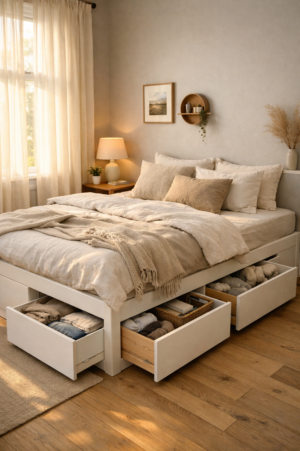 You can store extra blankets, seasonal clothes, or shoes right under where you sleep. This keeps your closet and floor clear.
