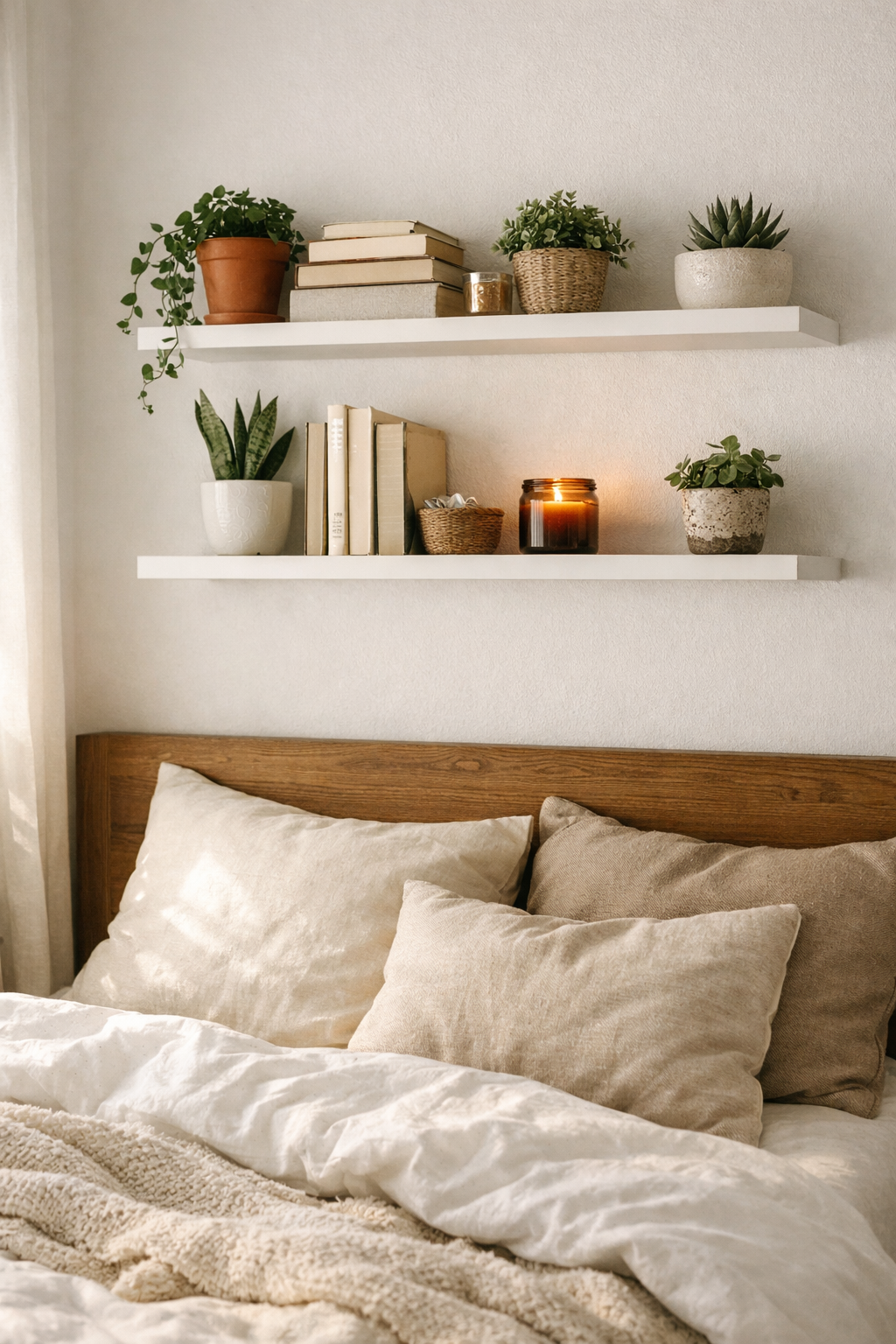 Use them for books, small plants, candles, or decorative items. This also draws the eye up, making the ceiling feel higher.