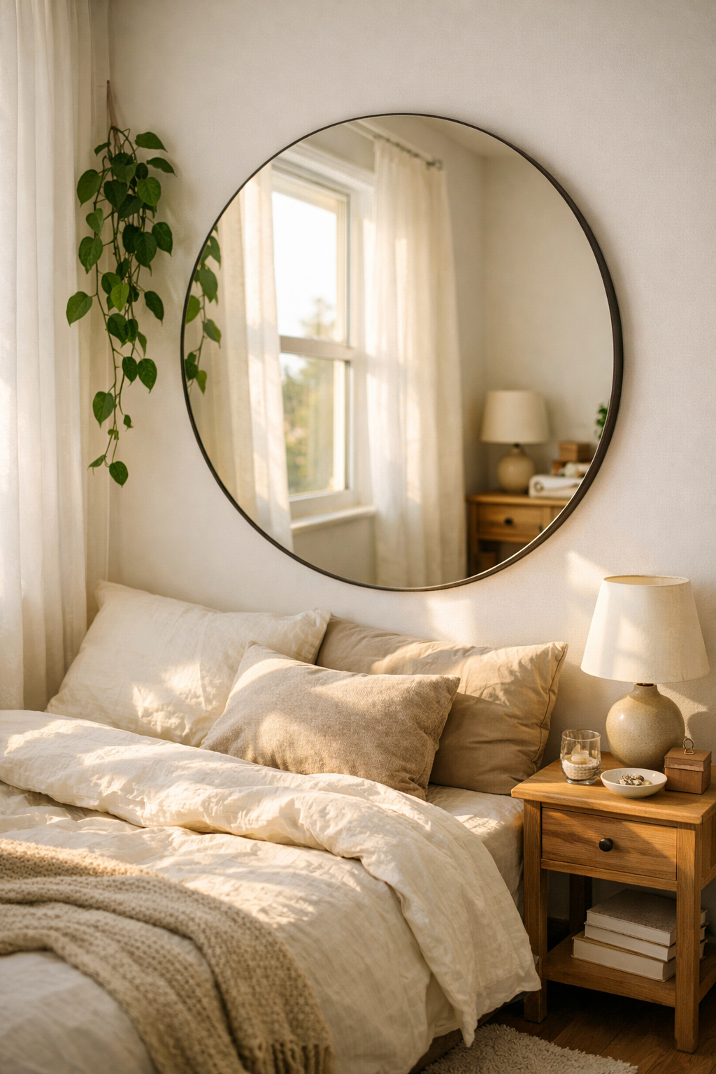 Use light wall colors, hang curtains high, add mirrors, and keep the floor as clear as possible. These simple steps create the illusion of more space without changing the actual size of the room.