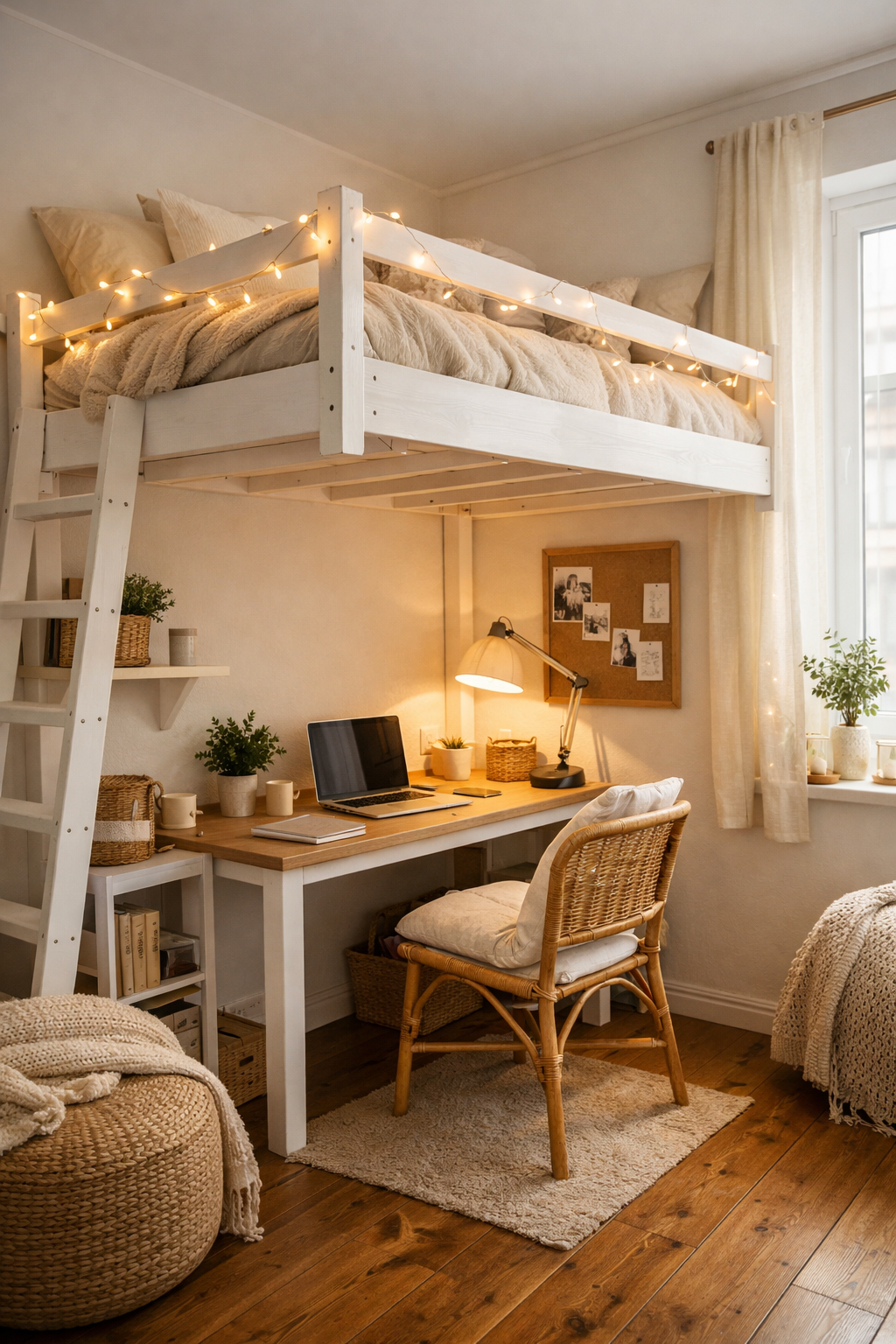 A loft bed raises your sleeping area up high and opens the floor below. You can use that floor space for a desk, a reading nook, or a small dresser.