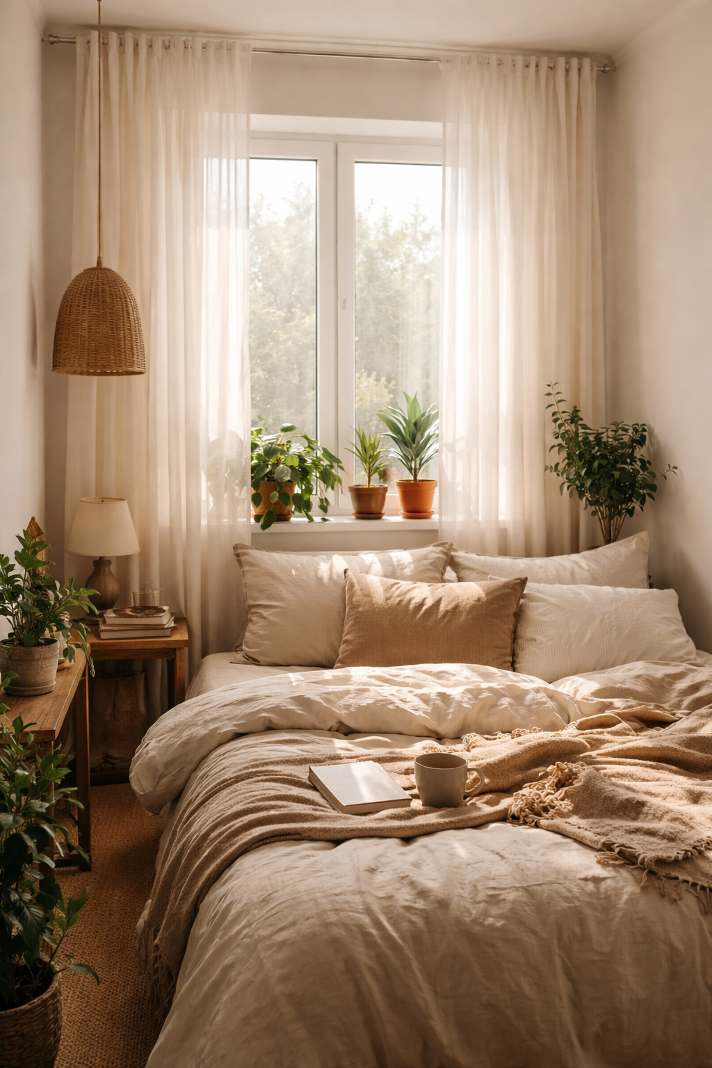 Plants make any room feel more alive. In a small bedroom, a few well-placed plants add color, texture, and a sense of calm.