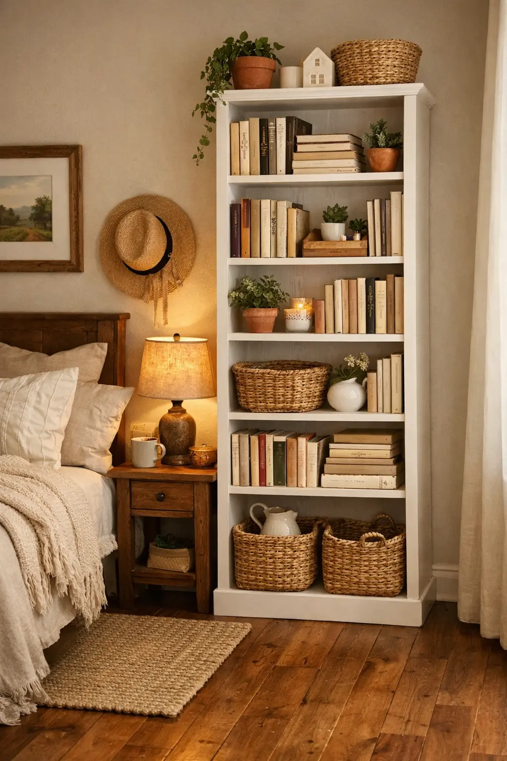 When floor space is tight, go vertical. A tall, narrow bookshelf is one of the best tiny bedroom storage ideas because it uses height instead of width.
