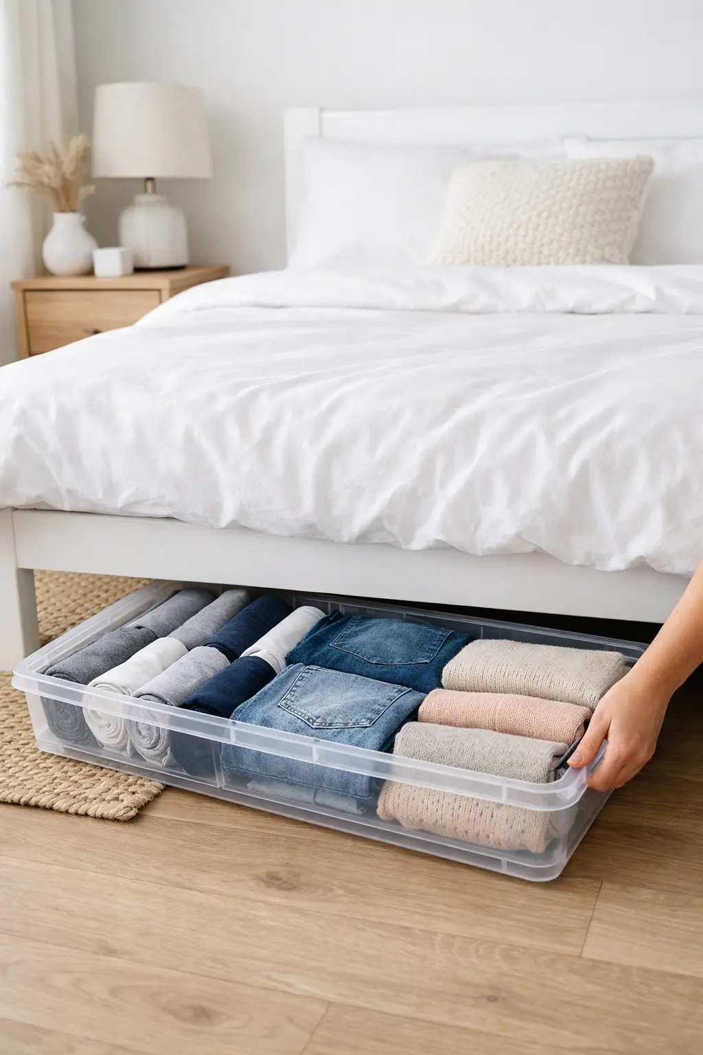The space under your bed is prime storage real estate. Use flat bins or rolling drawers to store clothes, shoes, extra bedding, or anything you do not need every day.