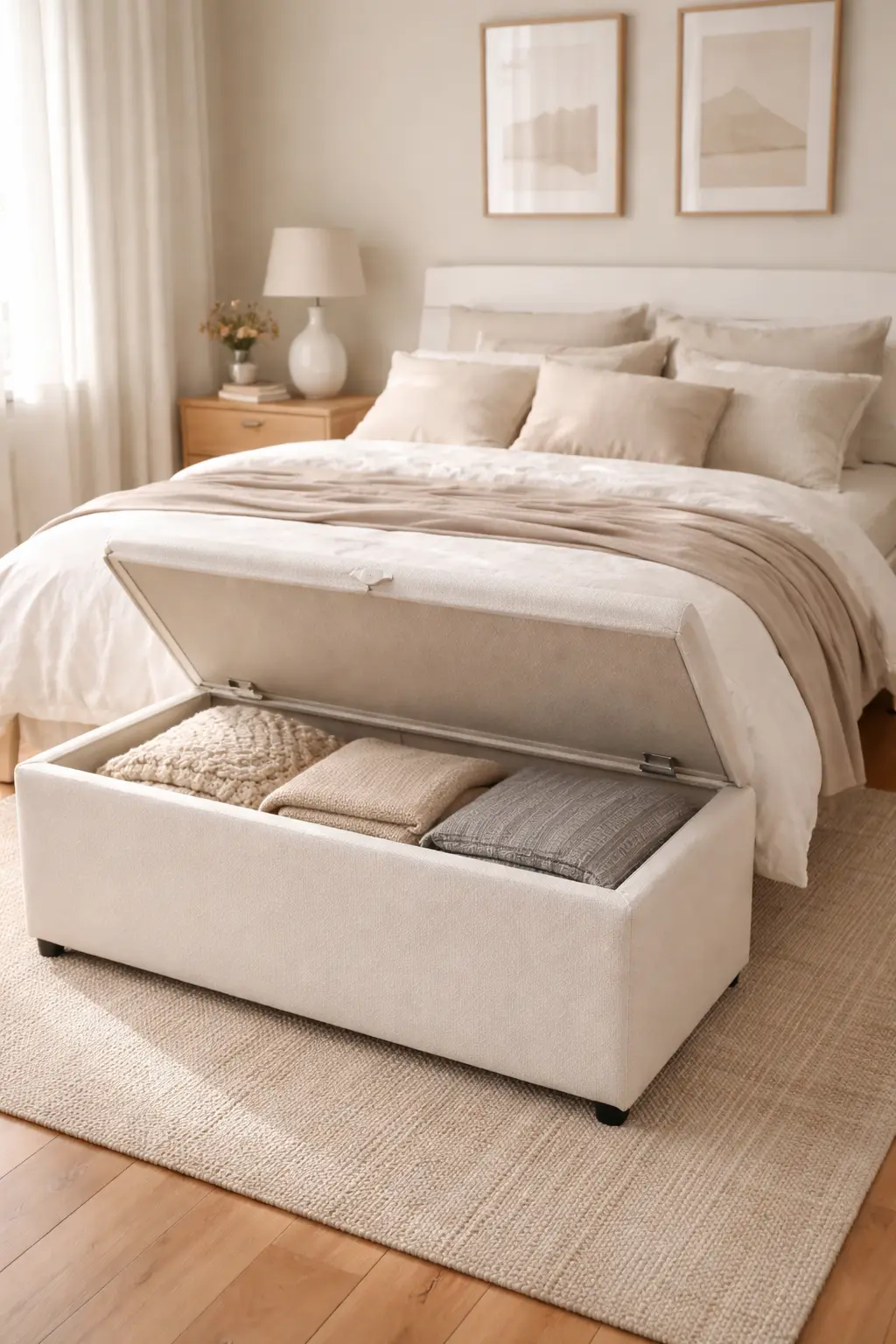 Look for ottomans that open up for storage or benches that have shelves underneath.