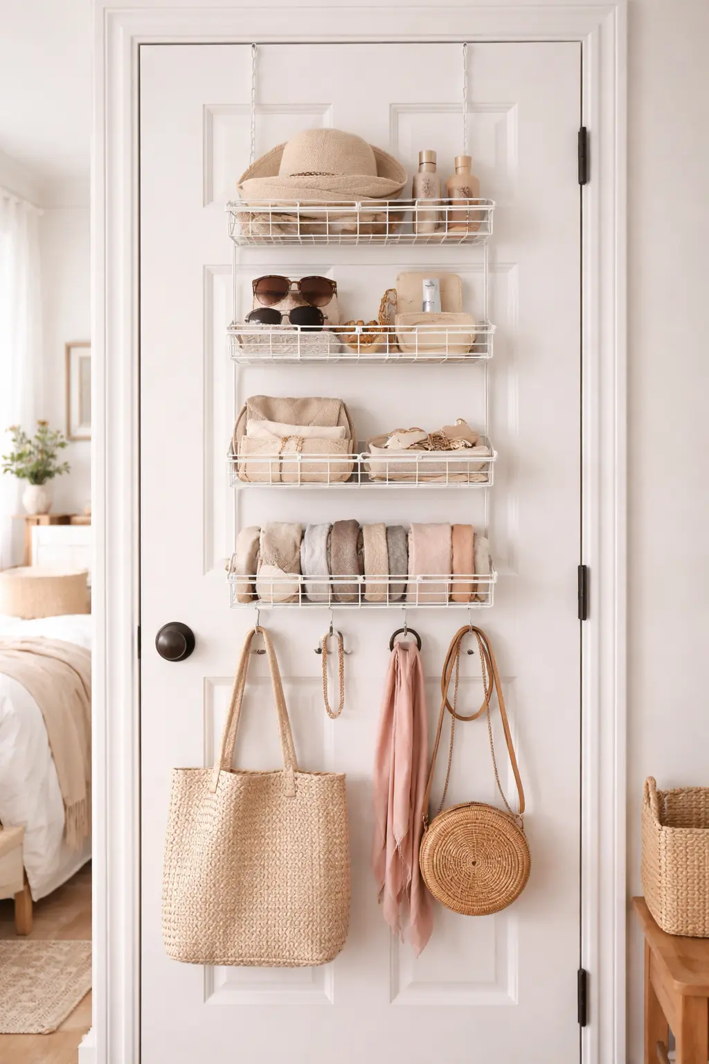 The back of your bedroom door is free wall space that most people never use. Add an over-the-door organizer, hooks, or a shoe rack to maximize this spot.