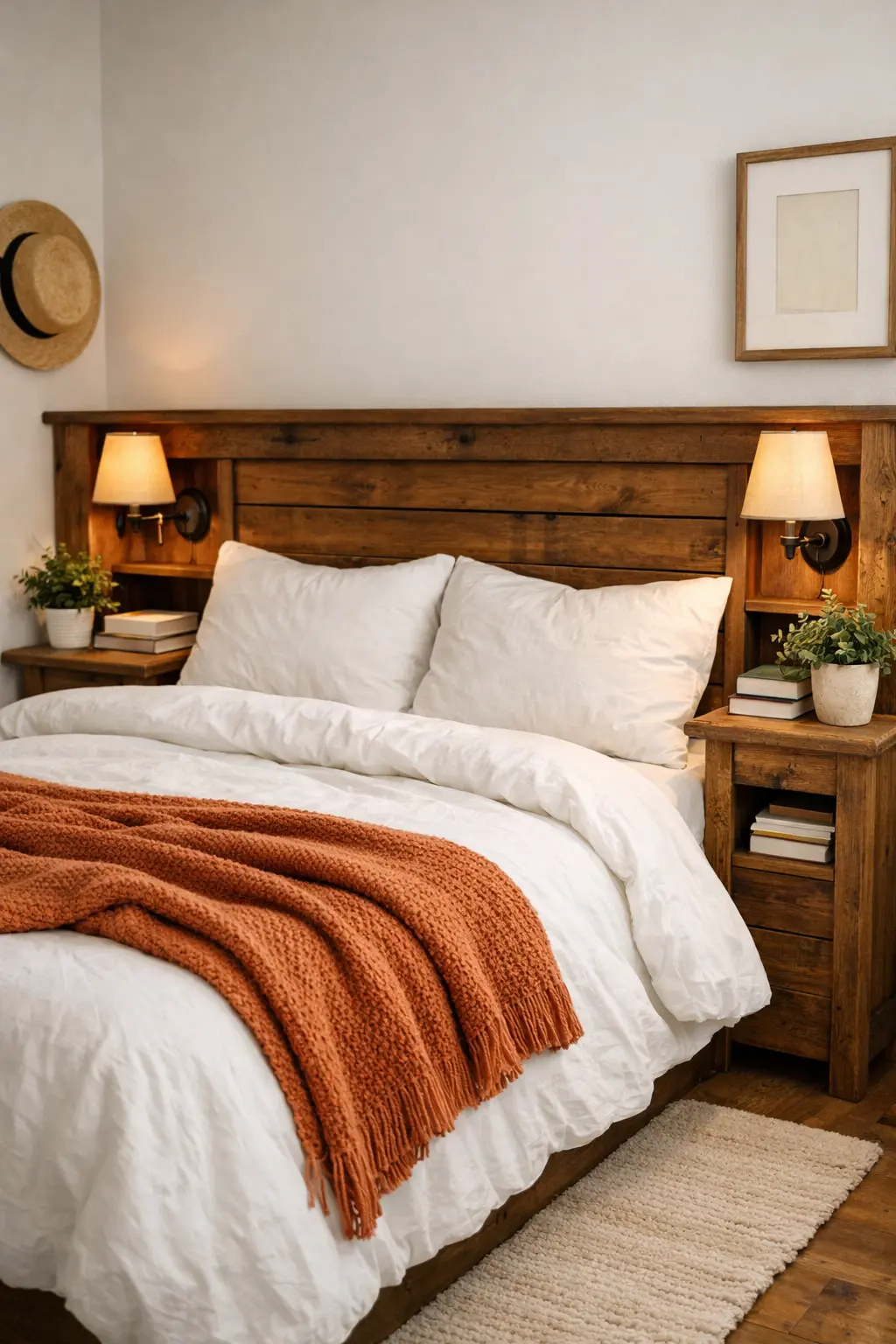 A headboard with shelves or cubbies replaces your nightstand and adds storage at the same time. It keeps your essentials close without cluttering up the floor.