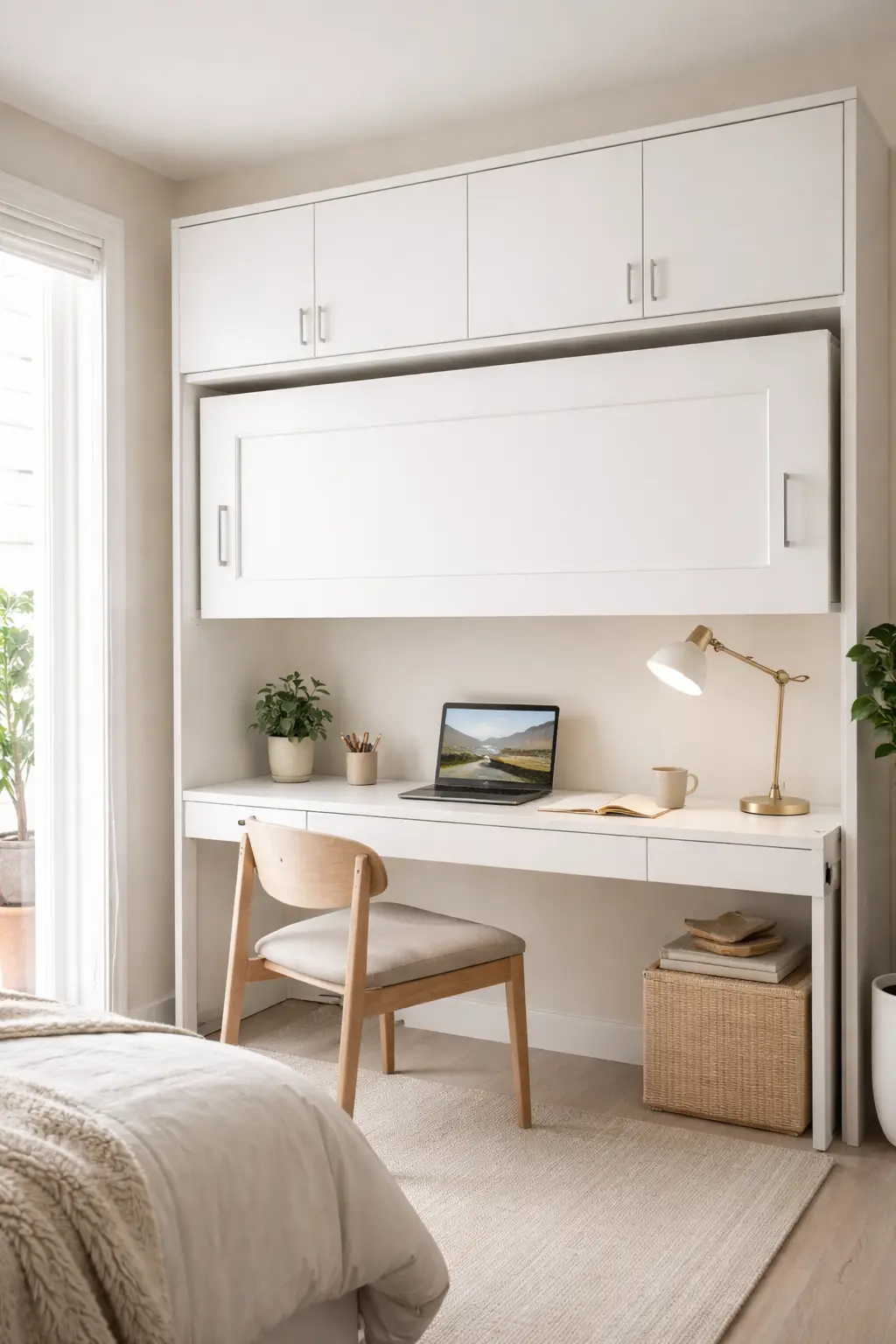 This idea is perfect for studio apartments or guest rooms that double as a home office. It is one of the most effective small bedroom layout ideas for tight spaces.