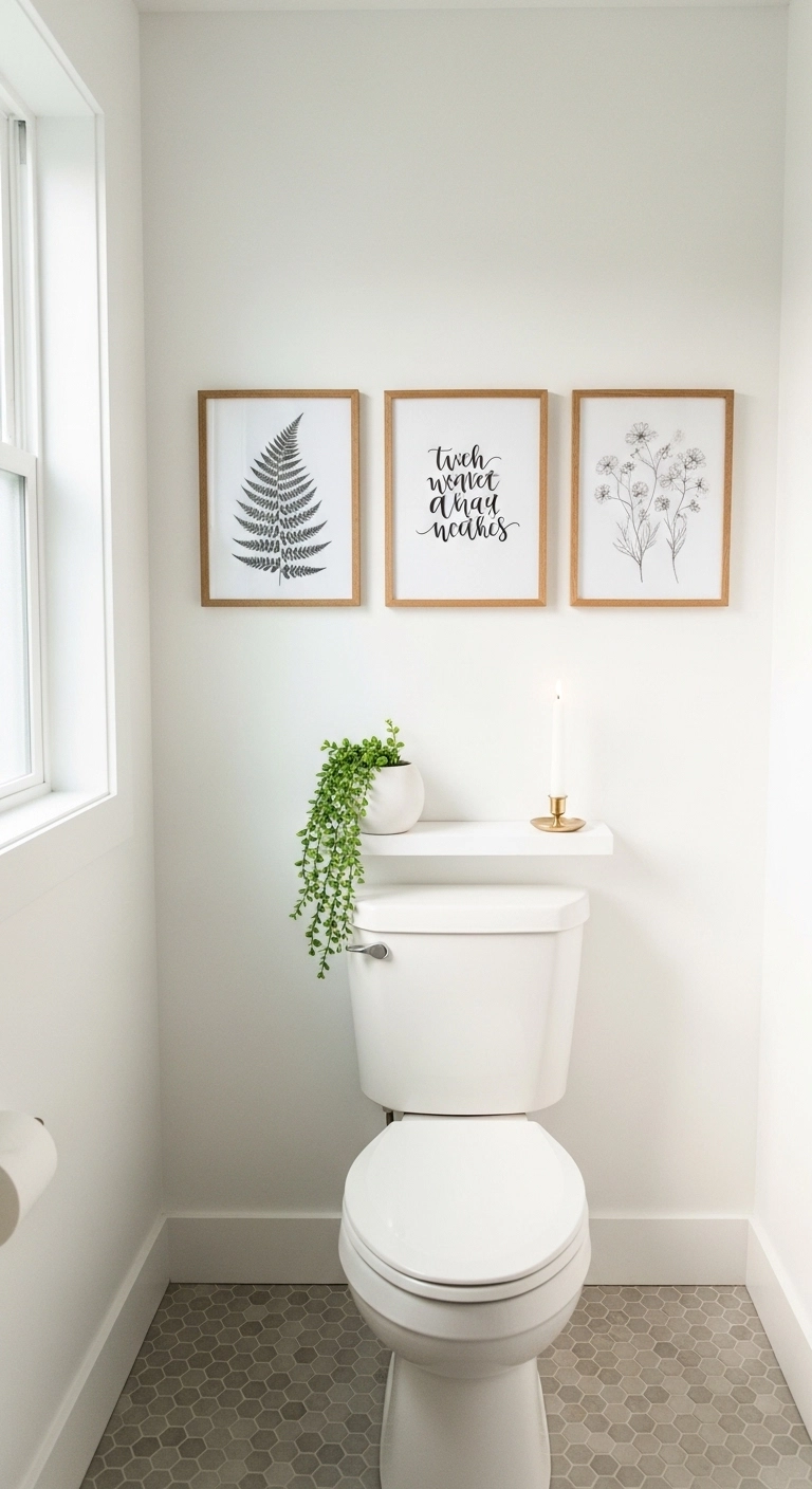 Group two or three small prints together in matching frames for a simple gallery wall above the toilet or beside the vanity. Keep the frames consistent in color so everything looks cohesive and planned. You can find beautiful affordable farmhouse style prints online and print them at home for almost no cost at all. This is one of those farmhouse bathroom decorating ideas on a budget that anyone can pull off in under an hour with beautiful results.