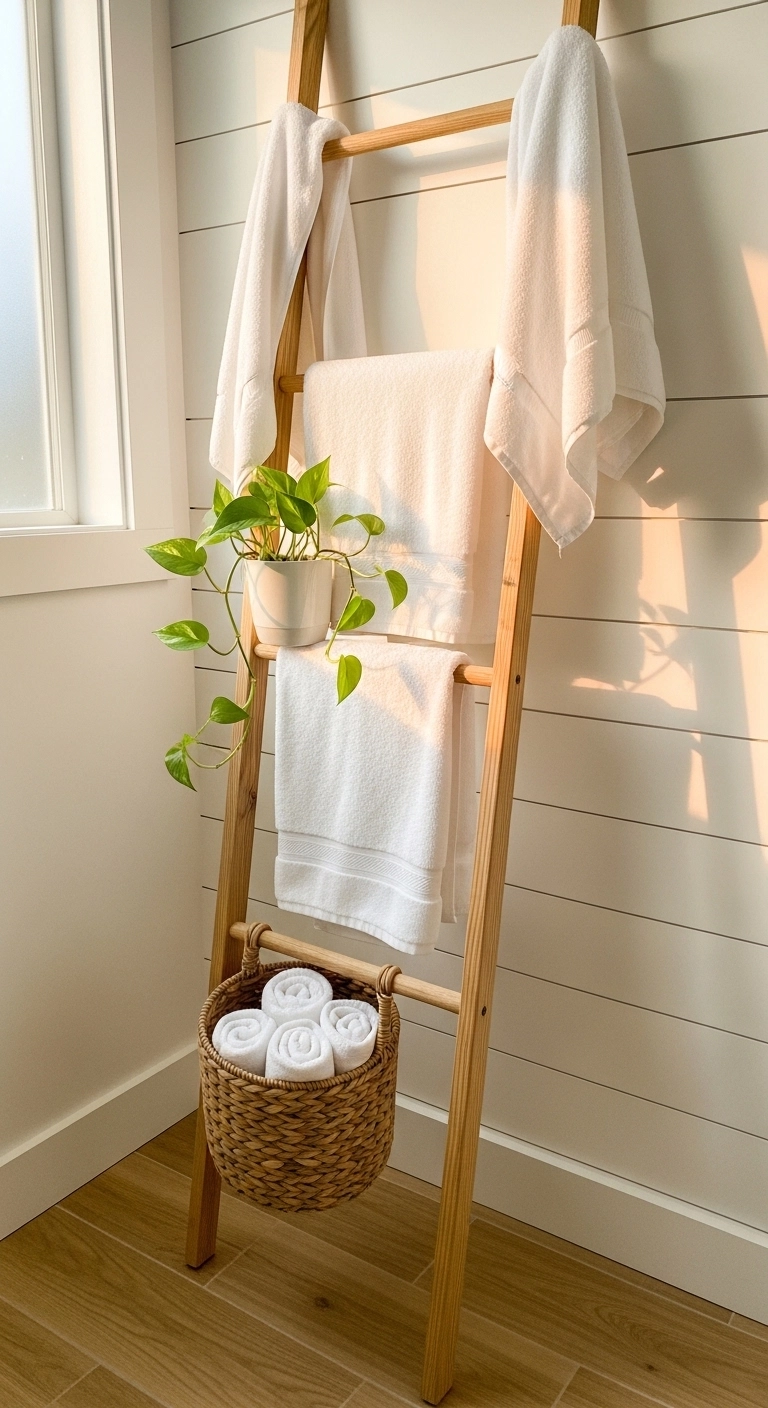 Choose a ladder in natural unfinished wood, whitewashed wood, or light oak to keep the look soft and warm. Drape thick white cotton towels over the rungs at different heights and hang a small woven basket from one of the lower rungs to hold extra toiletries or a hair dryer. Place a small plant or a candle on one of the wider rungs if there is room. It is practical, beautiful, and one of the easiest rustic farmhouse bathroom ideas you will ever try.