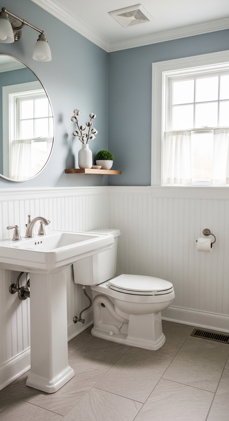 Paint your beadboard in soft white or warm cream and add a simple chair rail molding along the top edge where it meets the upper wall. Above the beadboard you can paint the wall in a soft complementary color like pale sage green, dusty blue, or warm greige for a beautiful two tone farmhouse look. This is one of the most classic modern farmhouse bathroom decor ideas, and it adds architectural character to even the plainest and most basic bathroom.
