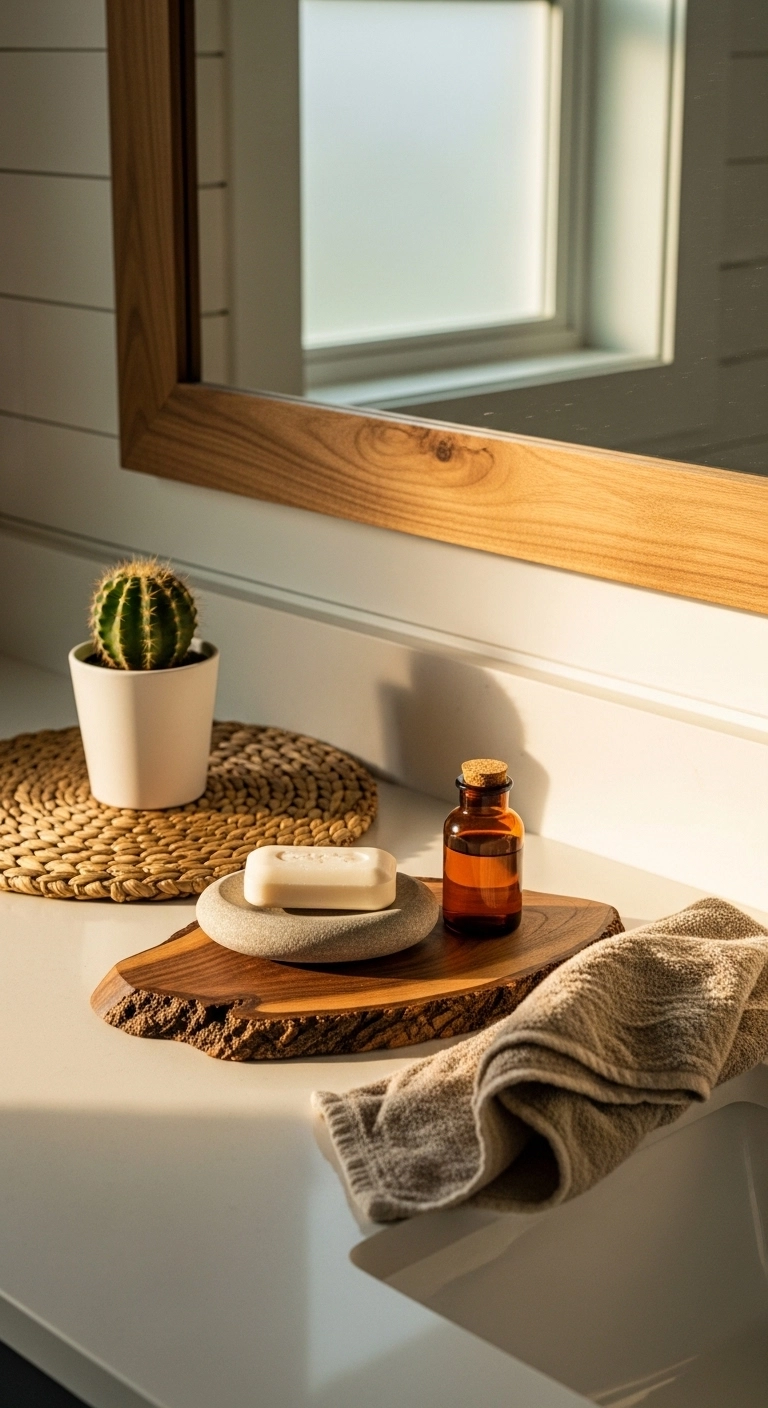 14. Bring in Natural Elements Like Wood Trays and Stone Soap Dishes