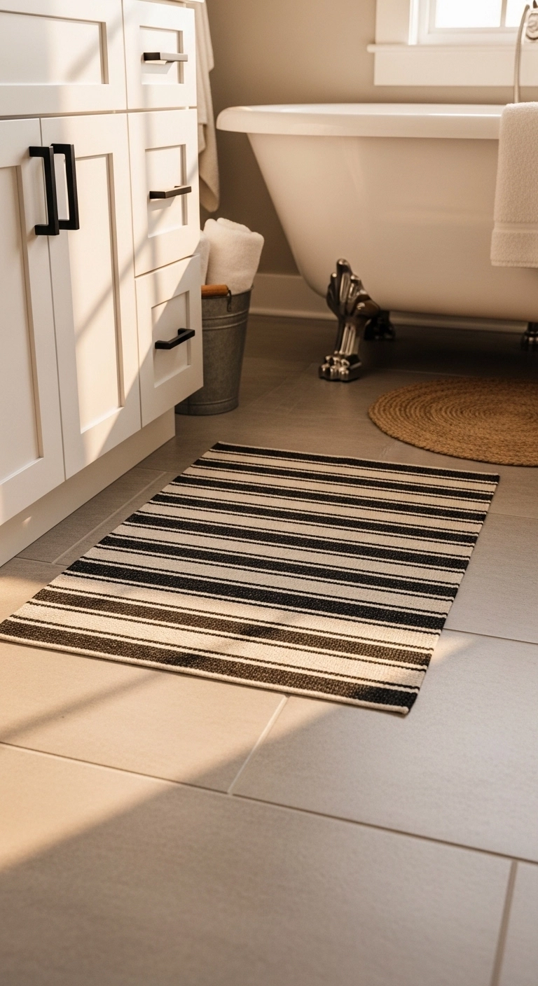 A bathroom rug might seem like a small detail but in a farmhouse bathroom it can completely change the mood and feel of the entire floor. A vintage style rug in faded warm tones, a simple black and white stripe, or a natural woven jute mat adds incredible warmth, texture, and pattern to the floor that plain tiles alone can never provide. It also makes the bathroom feel much more like a cozy and intentional living space.