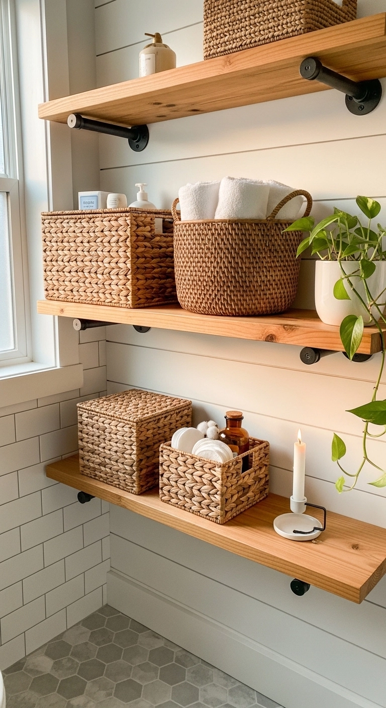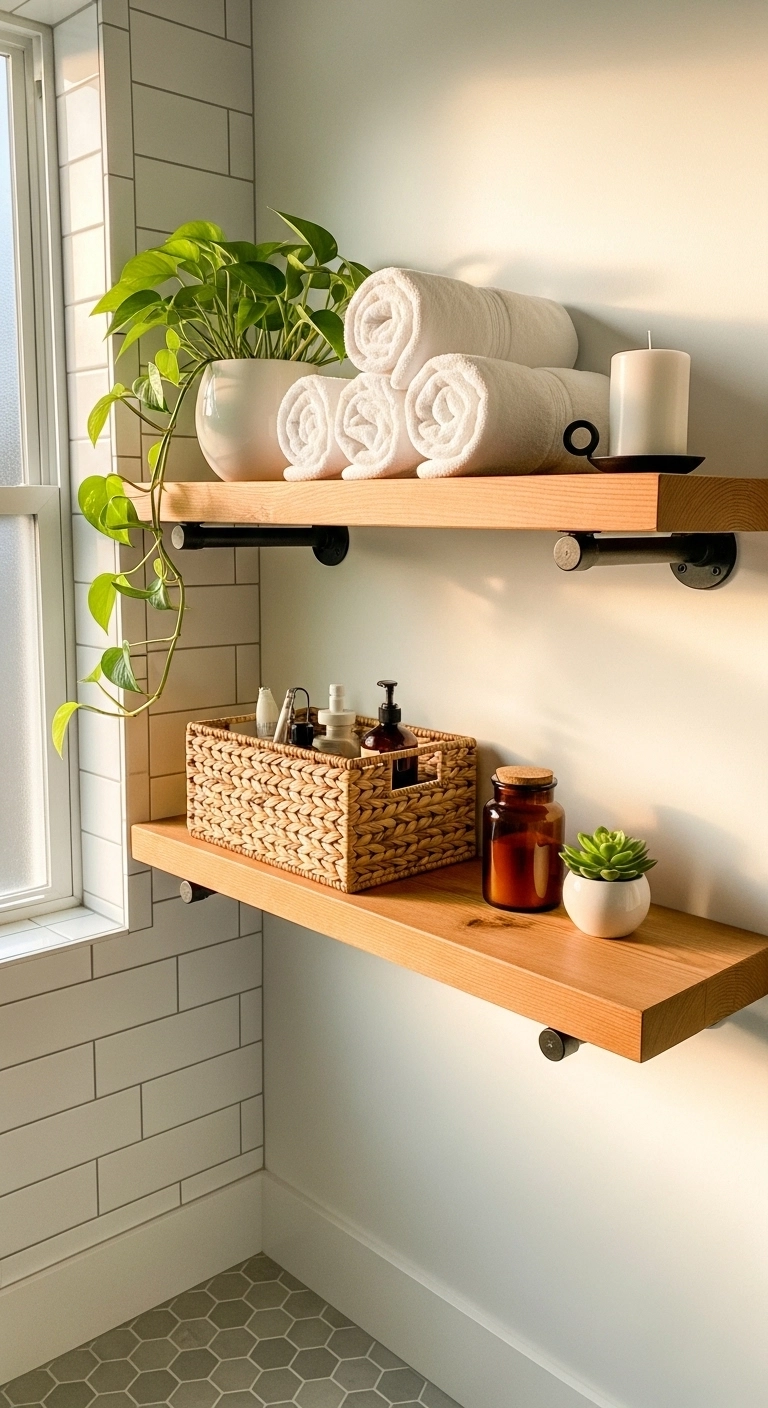 Use thick solid wood planks in a natural or whitewashed finish for the shelves themselves. Keep them styled simply with a few neatly rolled towels, a small plant, a candle, and one or two decorative pieces. Do not overcrowd them. The beauty of open farmhouse shelving is in the breathing room between each item. It is one of the most popular rustic farmhouse bathroom ideas and it works in bathrooms of every size.