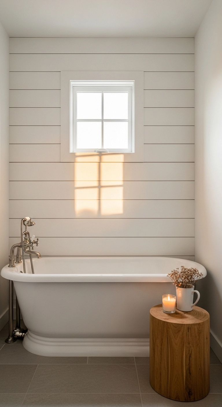 Paint your shiplap in soft white or warm cream to keep the bathroom feeling bright and airy. White shiplap works especially well behind the vanity or around the bathtub as an accent wall. It adds texture and visual interest to the room without making it feel cluttered or busy. It is one of the most popular rustic farmhouse bathroom ideas because it looks like it costs a lot more than it actually does.