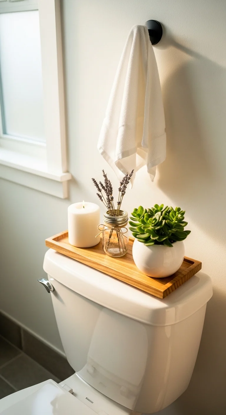 Most people completely ignore the top of their toilet tank and leave it empty or use it as a dumping ground for random items. In a farmhouse bathroom, the top of the toilet tank is actually a perfect little shelf for a beautiful and simple styled vignette. A small tray with a candle, a tiny plant, and a decorative object is all you need to turn this forgotten surface into a charming farmhouse moment.