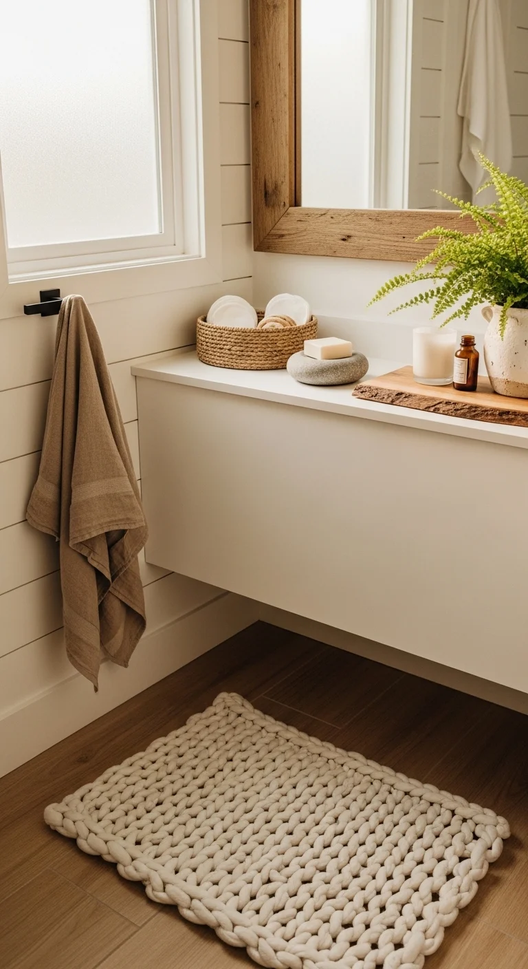 For a true farmhouse feel, look for a cotton washable rug in a classic stripe pattern or a small Persian inspired rug with faded warm reds, creams, and navy tones. A chunky woven jute or sisal rug is also a great natural option that fits perfectly into the farmhouse aesthetic. Place it in front of the vanity or beside the bathtub where you step out most often. This is one of the coziest and most affordable cozy farmhouse bathroom accessories you can add in under five minutes.