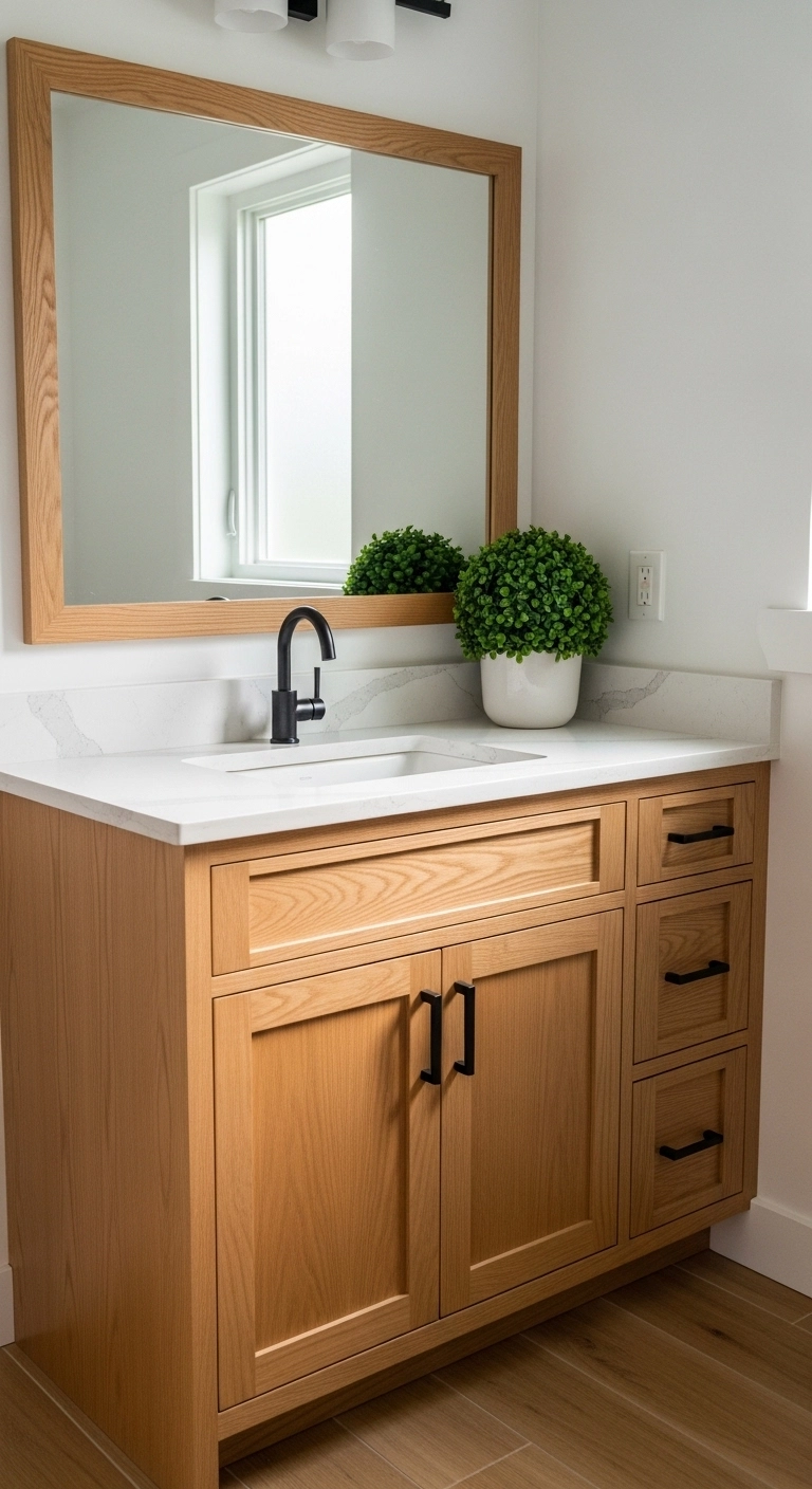 One of the fastest ways to bring modern farmhouse bathroom decor into your space is to replace a plain builder grade vanity with one that has a warm wooden finish. A vanity with natural wood tones, shaker style cabinet doors, and simple hardware immediately gives the bathroom that cozy lived in farmhouse feel that makes the space so inviting and special.