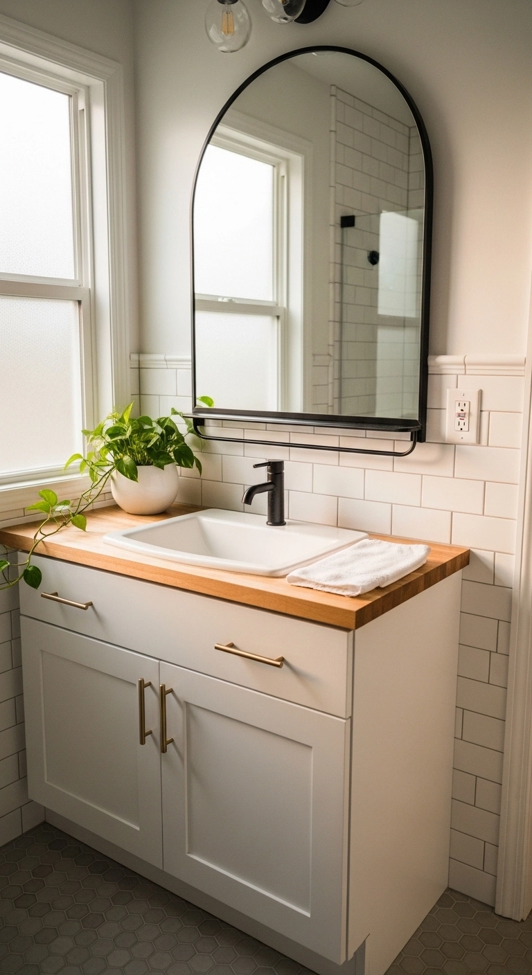 You do not have to buy a brand new vanity to get this look. You can paint your existing vanity in a warm white or soft sage green and swap out the hardware for brushed gold or matte black knobs and pulls. Adding a butcher block or light wood countertop on top takes the farmhouse look even further. It is one of the most effective farmhouse bathroom decorating ideas on a budget that you can do in just one weekend.