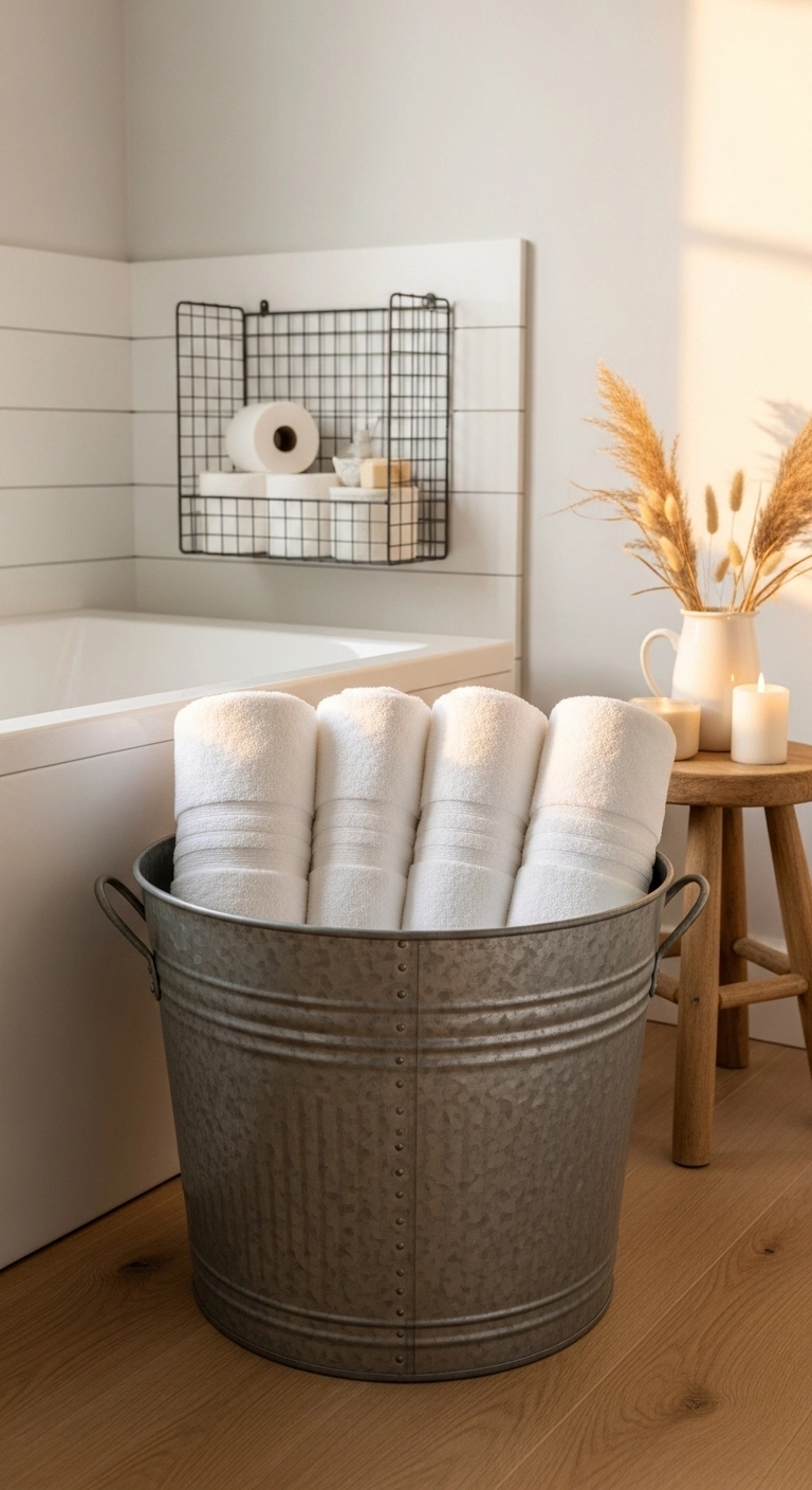 Use a large galvanized metal bucket beside the bathtub to hold rolled towels or a wire basket on a floating shelf to store extra toilet paper and toiletries. Even one or two of these pieces mixed into your bathroom decor is enough to shift the whole look toward that cozy vintage farmhouse style you are going for. They are also very functional so they earn their place in the room every single day.