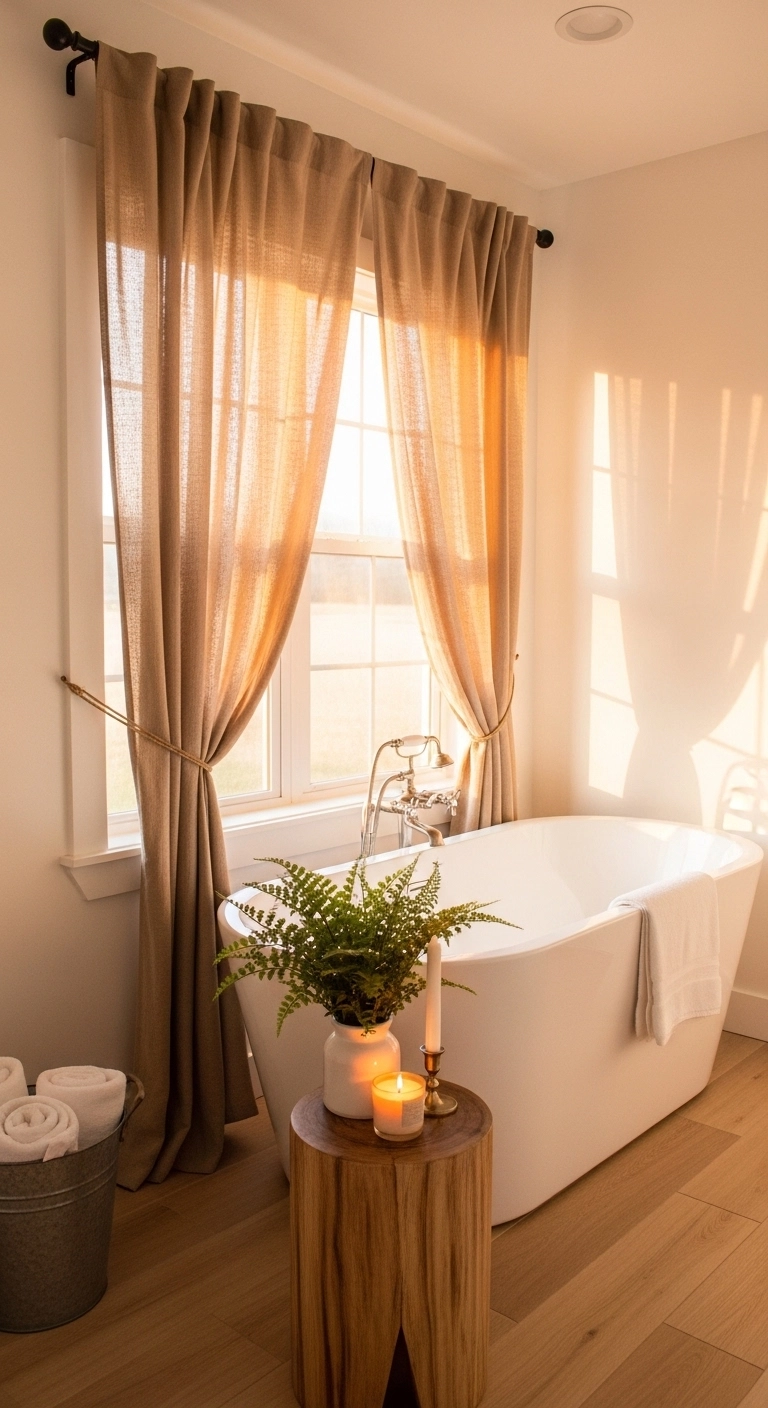 Window treatments play a big role in setting the mood of a farmhouse bathroom. Heavy synthetic curtains feel out of place in this style. Instead, choose simple panels in natural linen or soft white cotton to dress your bathroom window. These lightweight fabrics let soft natural light filter through beautifully while adding that gentle relaxed texture that is so central to the farmhouse look.