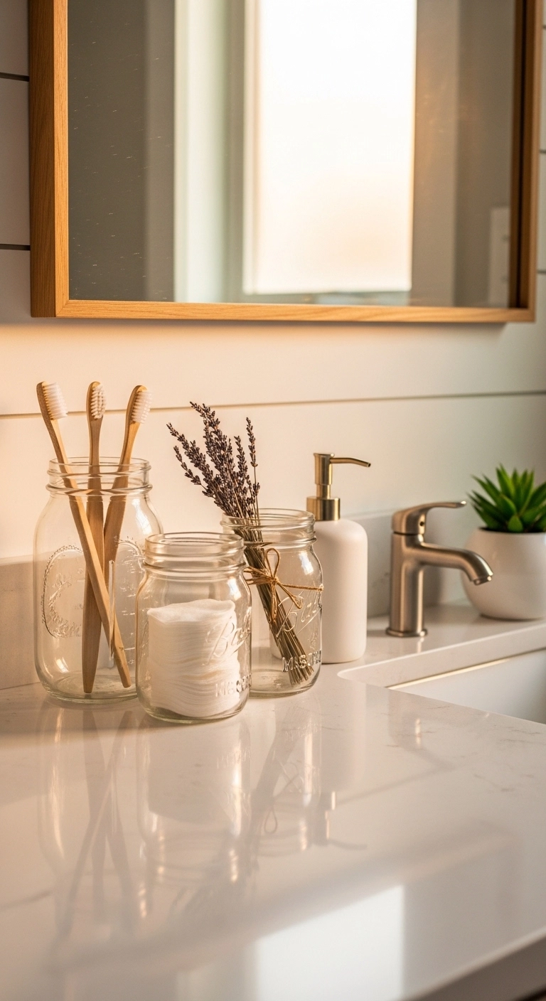 Mason jars are one of the most classic and beloved elements of vintage farmhouse style. They are incredibly versatile, very affordable, and instantly recognizable as part of the farmhouse aesthetic. In a bathroom you can use them to hold cotton balls, cotton swabs, toothbrushes, hand soap, small flowers, or dried herbs. A group of two or three mason jars together on a shelf or vanity counter looks charming and beautifully organized at the same time.
