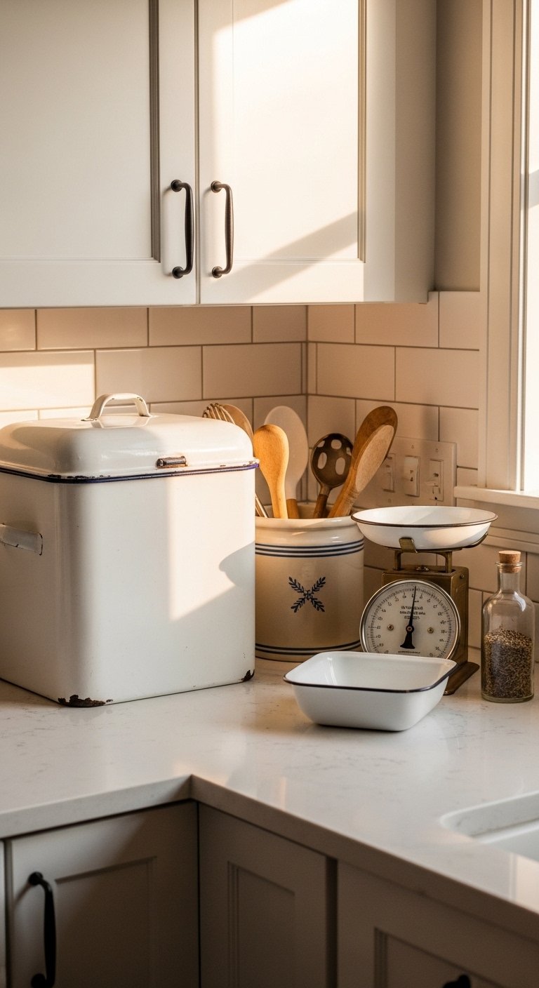 Incorporating vintage and antique accessories into your kitchen is one of the most creative and personal ways to build that authentic vintage farmhouse kitchen style that makes this design aesthetic so deeply warm and characterful. A vintage enamel bread bin, an old metal milk jug used as a utensil holder, an antique scale on the counter, or a collection of vintage ceramic crocks on the open shelves all add genuine history and soul to the kitchen that new accessories simply cannot replicate.