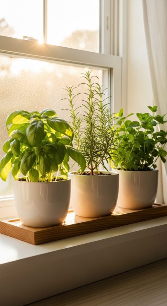 Fresh culinary herbs like basil, rosemary, mint, and thyme are the most practical plant choices for a farmhouse kitchen because they look beautiful, smell wonderful, and give you fresh ingredients to cook with every day. Keep them in simple matching white ceramic pots on your sunniest windowsill for a clean and cohesive farmhouse look. This is one of the most affordable and rewarding cozy farmhouse kitchen accessories ideas because a small herb plant costs almost nothing and gives back so much beauty and flavor.