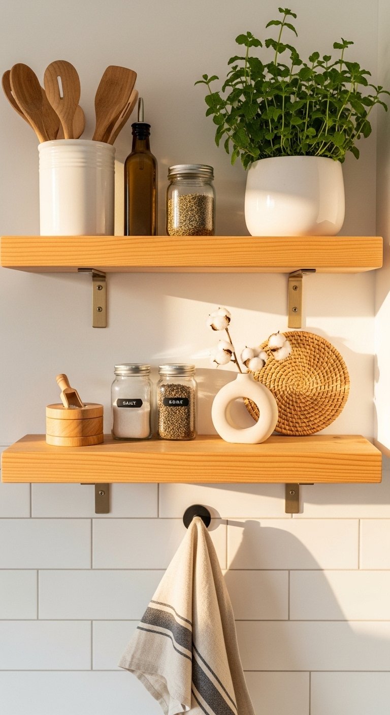 Style your farmhouse floating shelves with a mix of practical and decorative items. Neatly rolled white dish towels, a small potted herb, a few amber glass bottles, a wooden cutting board leaning against the wall, a ceramic canister, and a small vase with dried flowers all work beautifully together on open kitchen shelves. The key is to leave breathing room between items so the shelves feel styled and intentional rather than crowded and cluttered.