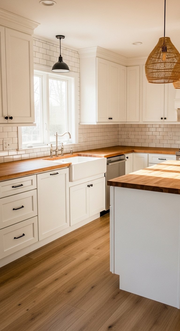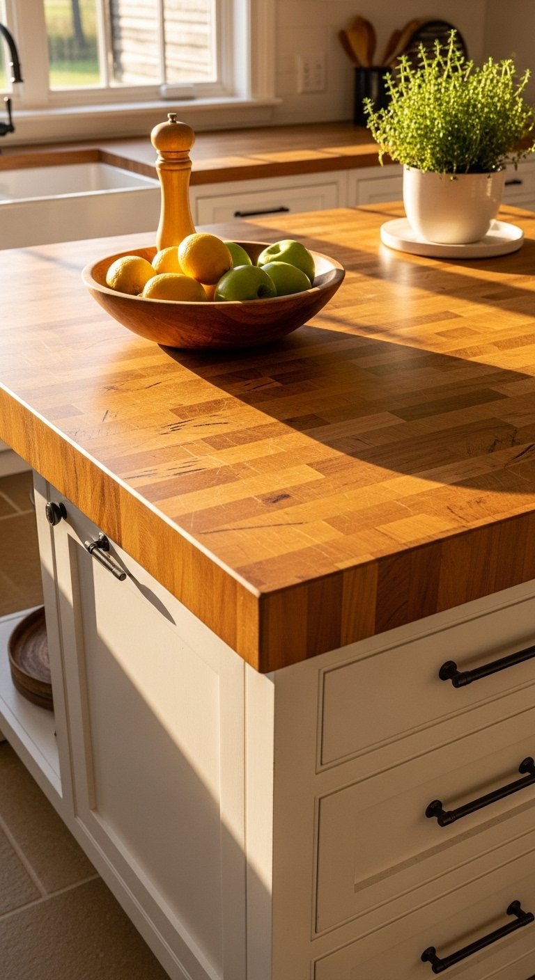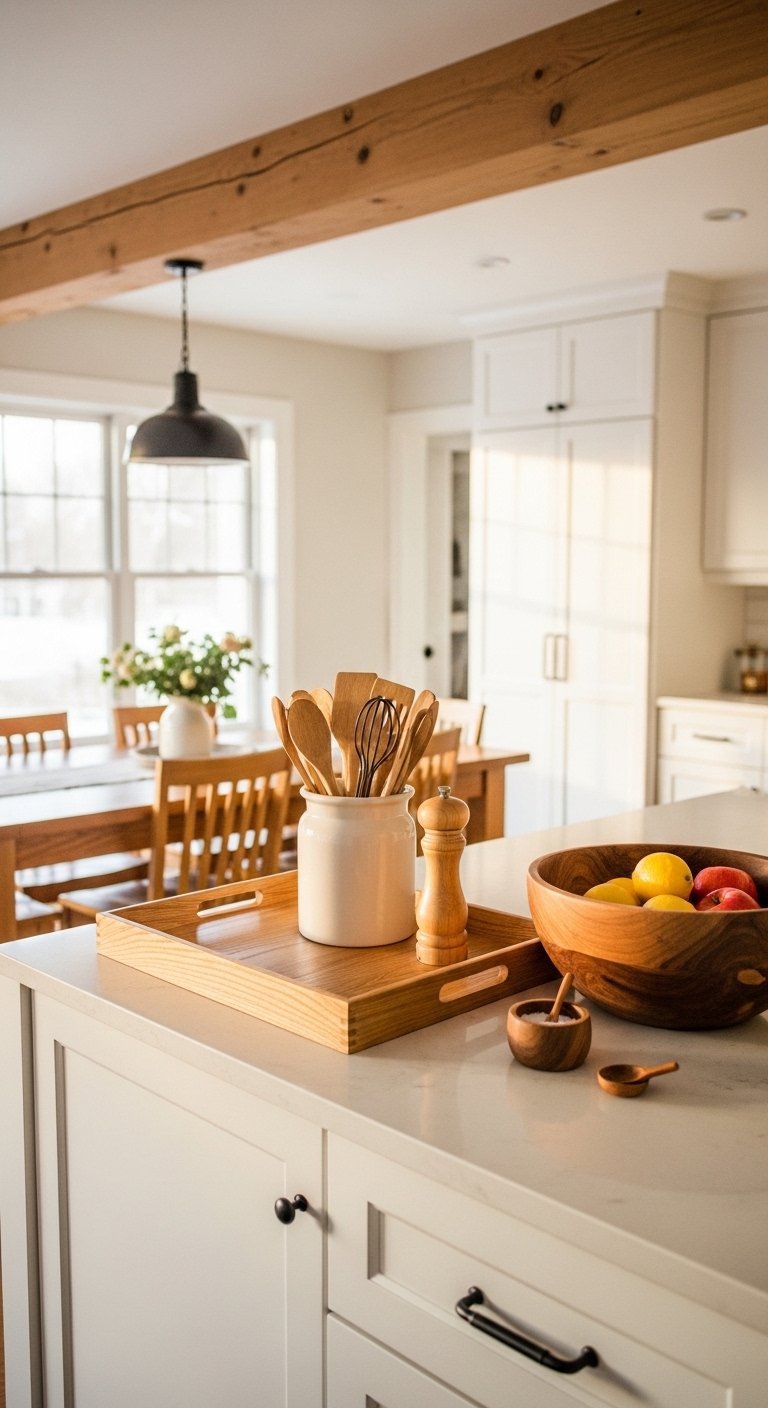 Start small if a full butcher block countertop is not in your budget right now. Add a wooden serving tray on the counter, a set of wooden handled utensils in a ceramic crock beside the stove, a wooden fruit bowl, and a few wooden cutting boards of different sizes. Together these small natural wood touches create a kitchen that feels genuinely warm, grounded, and full of that cozy farmhouse character that makes this style so deeply appealing and timeless.