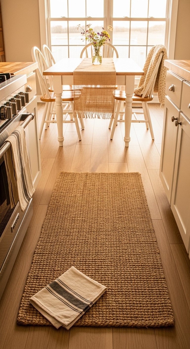 The finishing touch that brings every farmhouse kitchen completely to life is the addition of warm and natural textiles layered thoughtfully throughout the space. Natural linen dish towels draped over the oven handle, a chunky woven cotton runner rug on the kitchen floor, a simple burlap table runner on the kitchen table, and a soft knit throw draped over a chair in the kitchen eating area all work together to create a kitchen that feels deeply warm, cozy, and genuinely inviting.