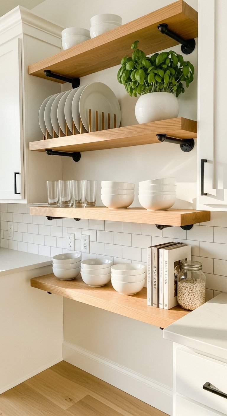 Use thick solid wood planks in a natural oak or whitewashed finish supported by chunky matte black iron brackets for the most authentic farmhouse look. Style your shelves with matching white dishes, a small herb plant, a wooden cutting board, a few cookbooks, and one or two glass jars filled with dry goods. Keep the styling simple and uncluttered and your open shelves will become the most beautiful and functional feature in your entire farmhouse kitchen.