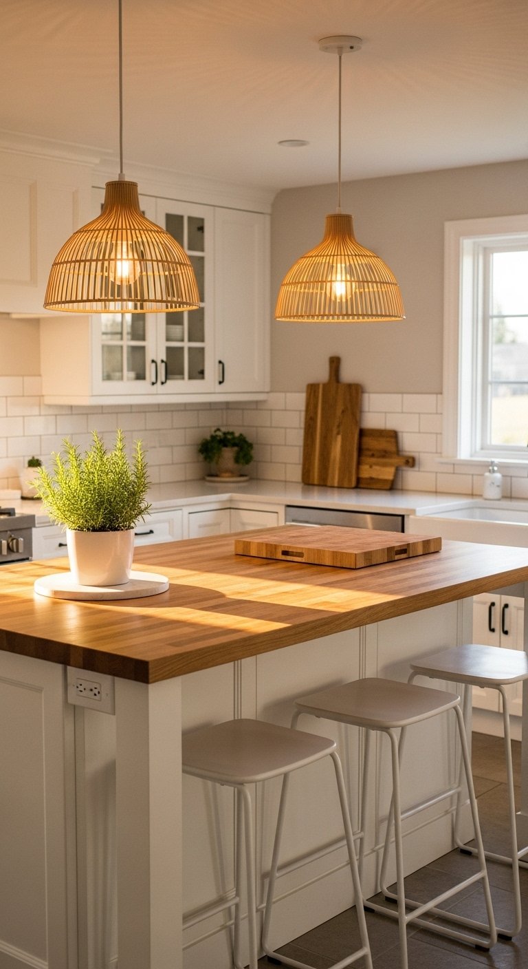 Lighting plays an enormous role in creating the warm and inviting farmhouse kitchen atmosphere that makes this style so irresistible. A pair of matching pendant lights hanging above your kitchen island or dining table is one of the most impactful warm farmhouse kitchen lighting upgrades you can make. Pendant lights in natural rattan, weathered black metal, antique brass, or brushed gold all bring instant farmhouse warmth and character to the kitchen.