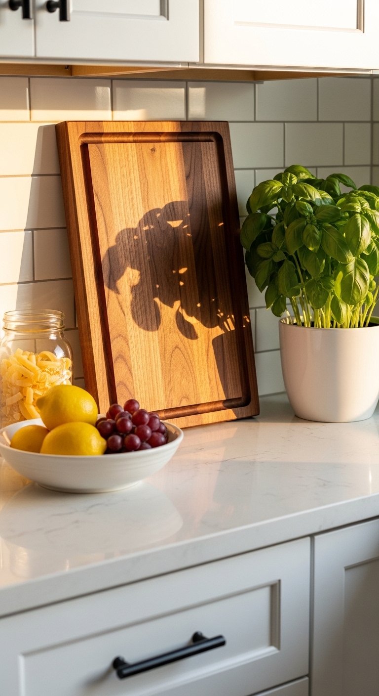 Choose a large cutting board in a light natural maple, rich walnut, or warm acacia wood for the most beautiful farmhouse display. A board with a juice groove, a handle cutout, or a live edge finish looks especially stunning when propped up against the backsplash. Pair it with a small herb plant and a simple fruit bowl beside it for a complete and effortless farmhouse counter vignette that is both beautiful and completely practical every single day.