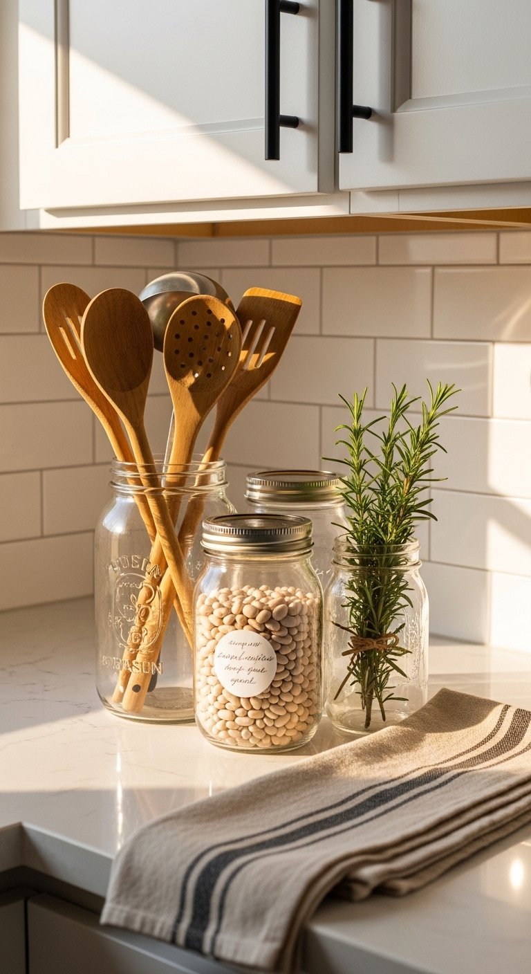 Mason jars are one of the most beloved and versatile elements of vintage farmhouse kitchen style and using them throughout your kitchen is one of the most charming and affordable cozy farmhouse kitchen accessories ideas you will find. On the counter you can use mason jars to hold wooden utensils, fresh herb cuttings in water, dried pasta, sugar, or fresh flowers. On open shelves they can store dry goods while also looking absolutely beautiful and intentional.
