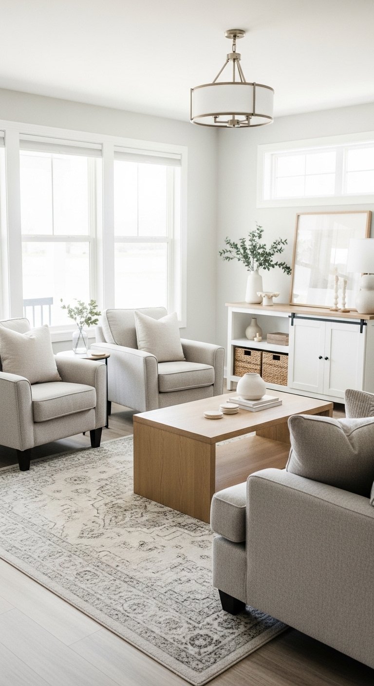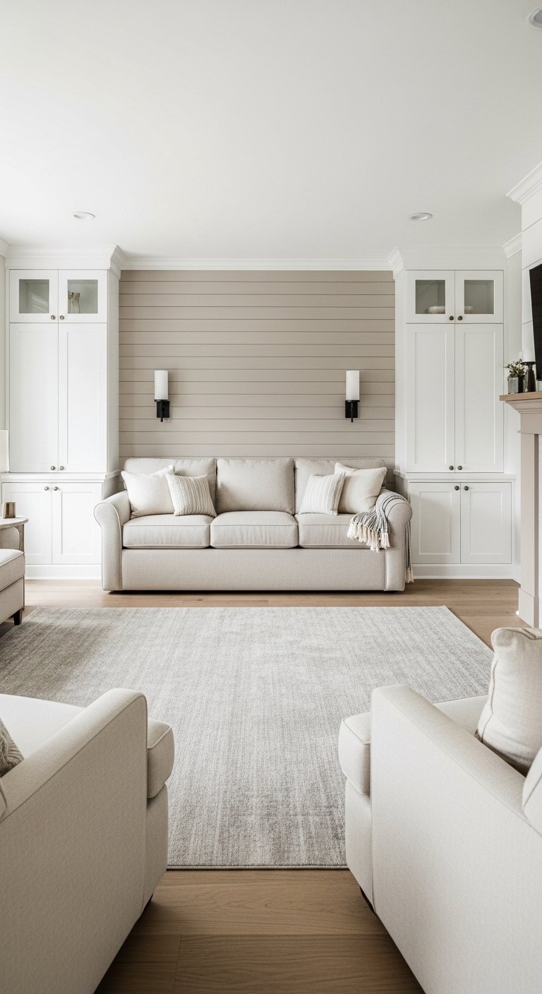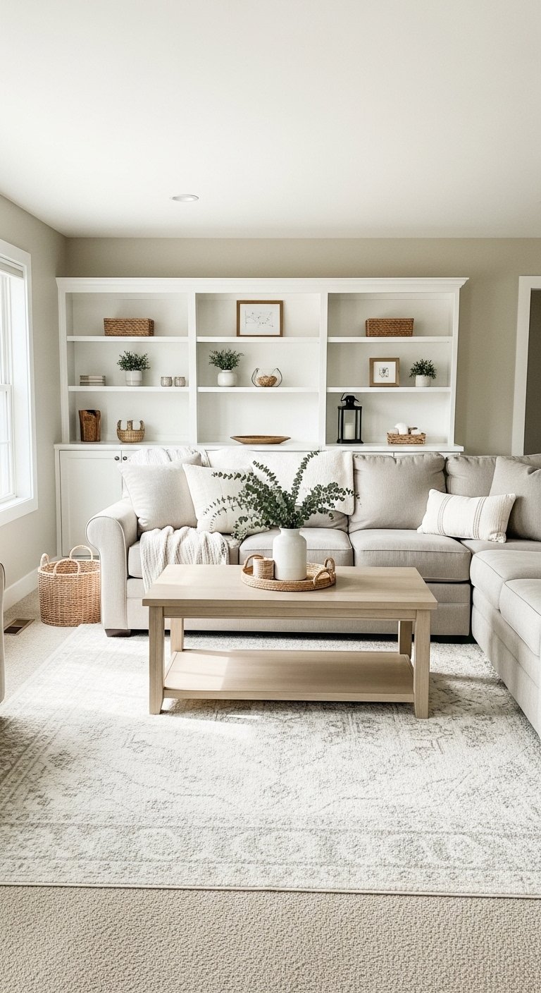 Large rugs make the seating area look complete. They also add warmth under your feet and soften hardwood floors. Choose neutral tones with subtle texture instead of bold patterns. This keeps the room feeling calm and modern. An oversized rug brings the furniture together visually, which makes the entire layout feel more intentional and polished.