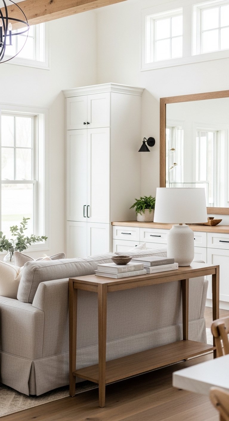 This is one of the most practical small living room decor tips because it adds storage without crowding the floor. Choose a narrow design in wood or painted finish that matches your style. A console table can also help divide open floor plans gently. When styled simply, it feels useful and clean rather than decorative clutter.