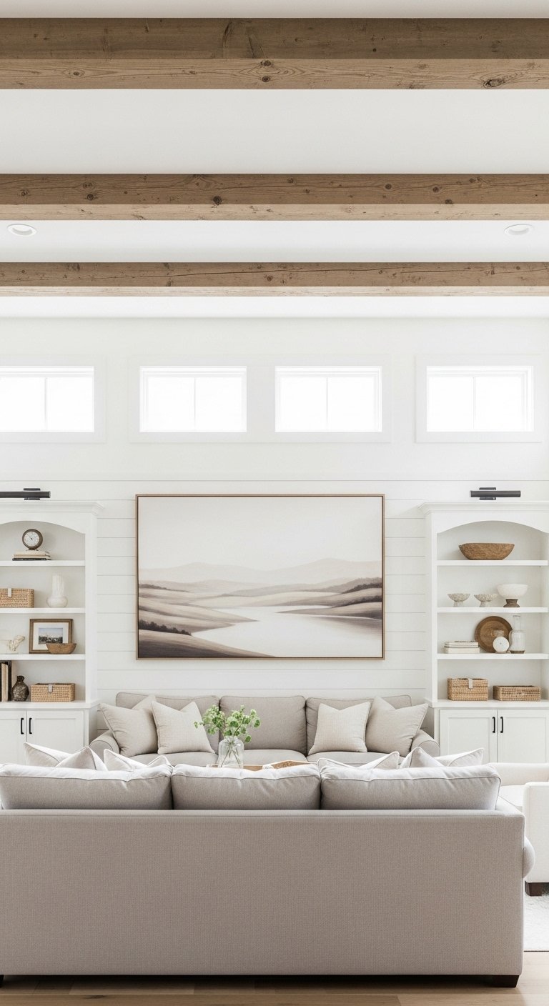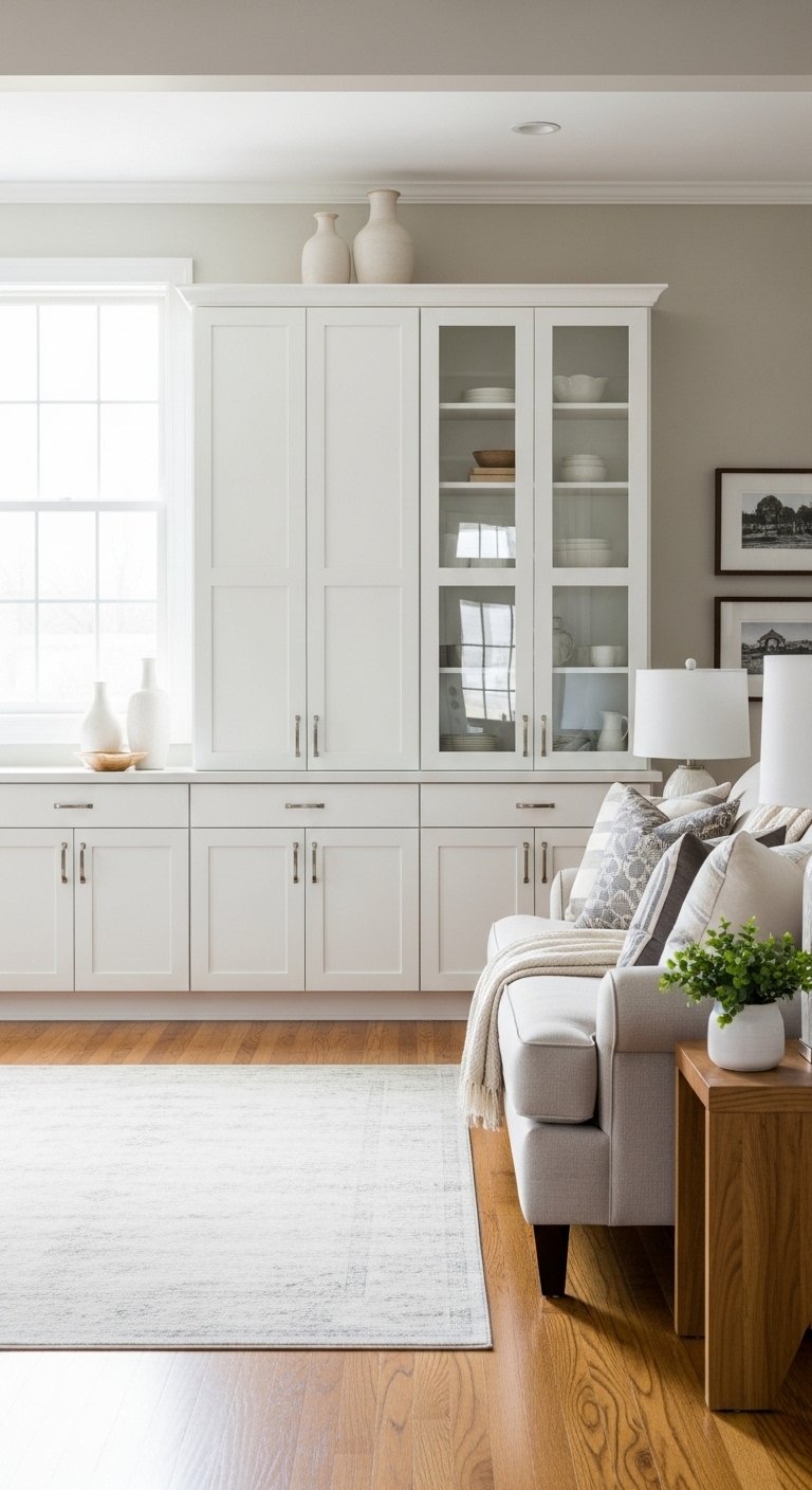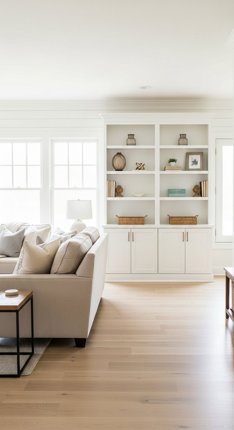 Clutter quickly makes a living room feel stressful. Built-in cabinets or open shelving give everything a proper place. Instead of random storage bins, the room feels organized and clean.