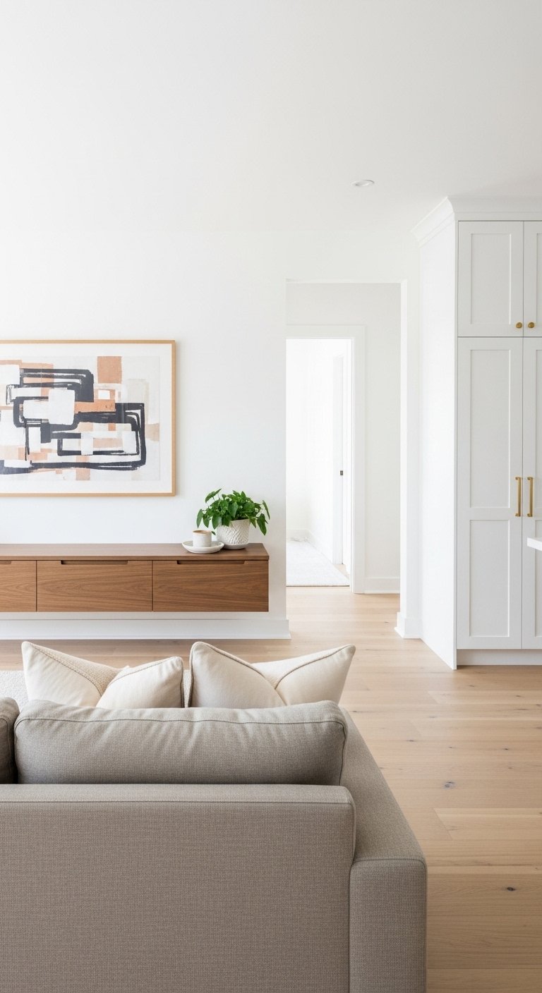 Choose art that fits your color palette and overall mood. Soft landscapes, abstract neutrals, or simple black-and-white prints work well. Large art pieces make ceilings feel taller and walls feel more finished. This approach keeps the room from feeling cluttered while still adding personality. In 2026, simple and intentional design is more important than filling every empty wall.