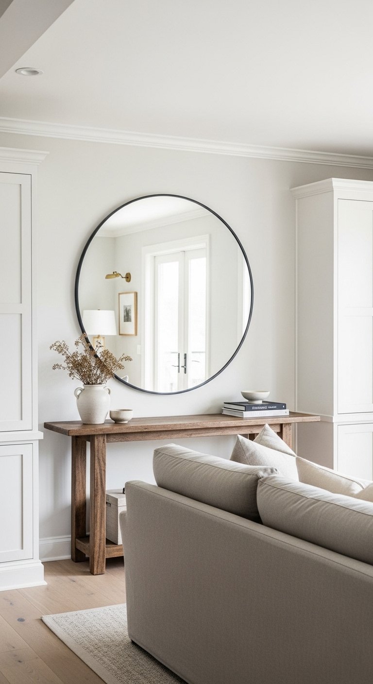Mirrors reflect natural light and make small rooms feel bigger. A large mirror above a console table works beautifully.