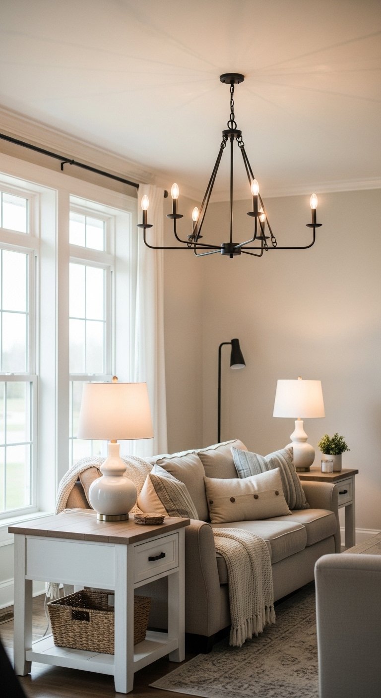 A floor lamp beside the sofa creates a comfortable reading spot. Look for simple shapes that match your decor.