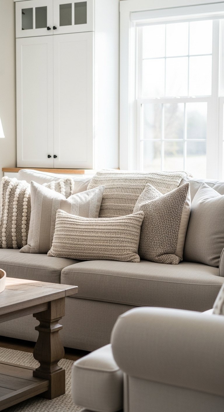 If your sofa feels flat or boring, pillows can change that quickly. Instead of adding bright colors, focus on texture. Textured throw pillows in linen, boucle, cotton, or knit fabrics add depth without overwhelming the room.