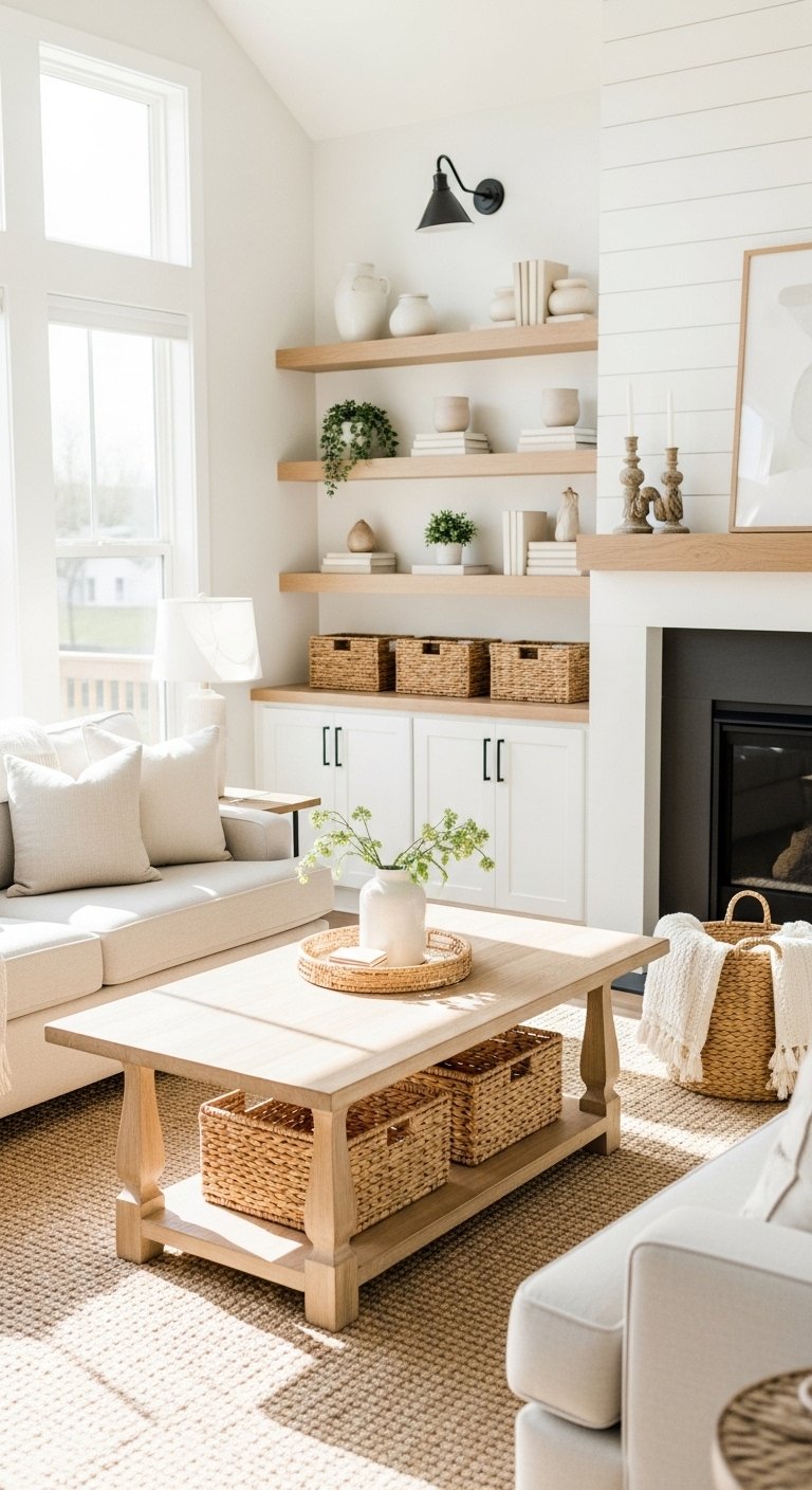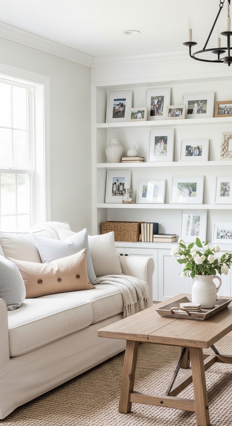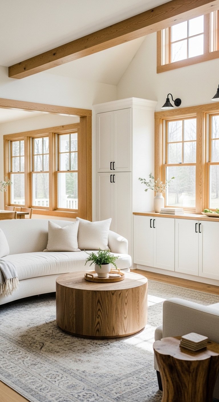 Light and medium wood tones work especially well because they brighten the space instead of making it heavy. In a modern farmhouse living room, wood balances soft fabrics and neutral walls. It keeps the room from feeling too plain. Even small touches like wooden picture frames or trays can add character. Natural materials make a space feel grounded and welcoming. When mixed with soft textiles and warm lighting, wood helps create a room that feels calm and lived-in rather than staged.