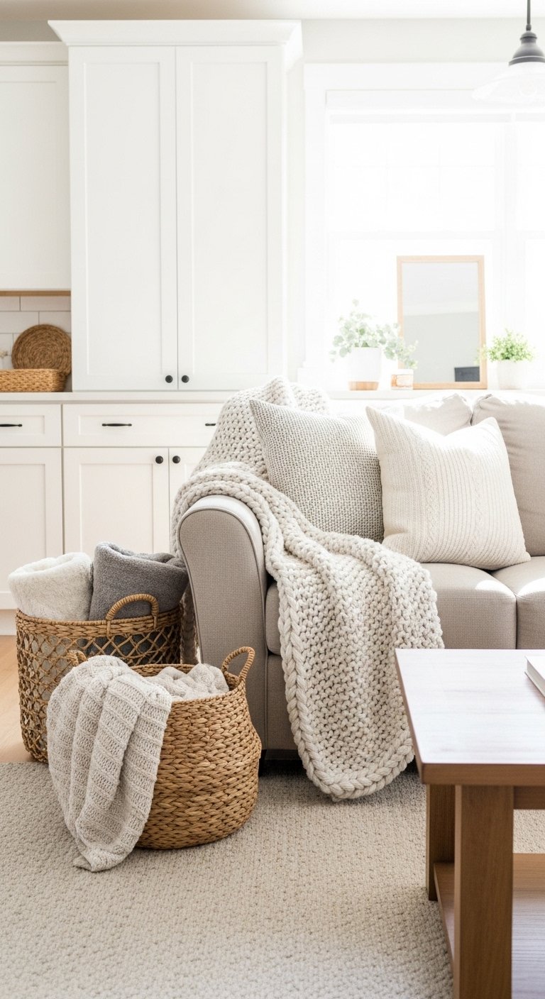 A throw blanket may seem small, but it changes the mood instantly. Layered throws add softness and warmth without much effort. Drape one over the sofa arm and fold another neatly in a basket nearby.