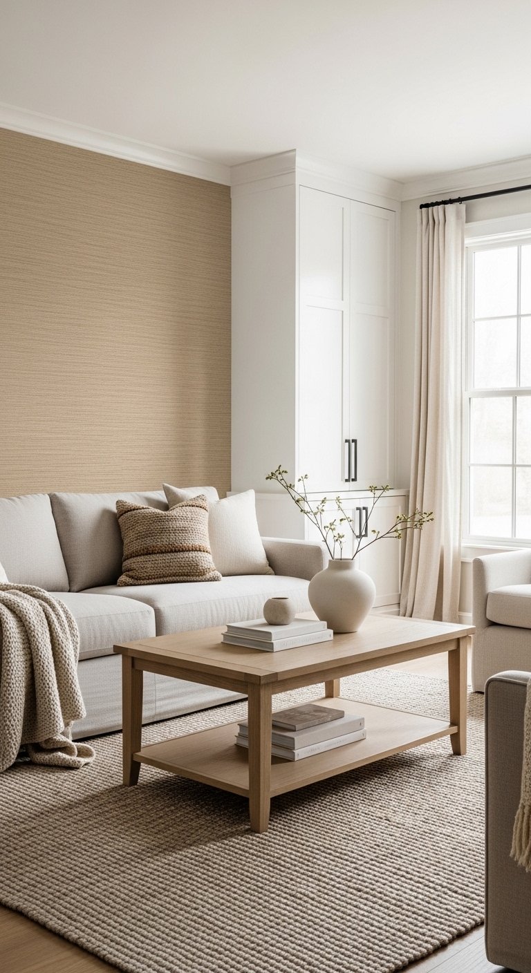 Soft textured wallpaper adds depth without bold patterns. Grasscloth or linen-inspired designs work well.