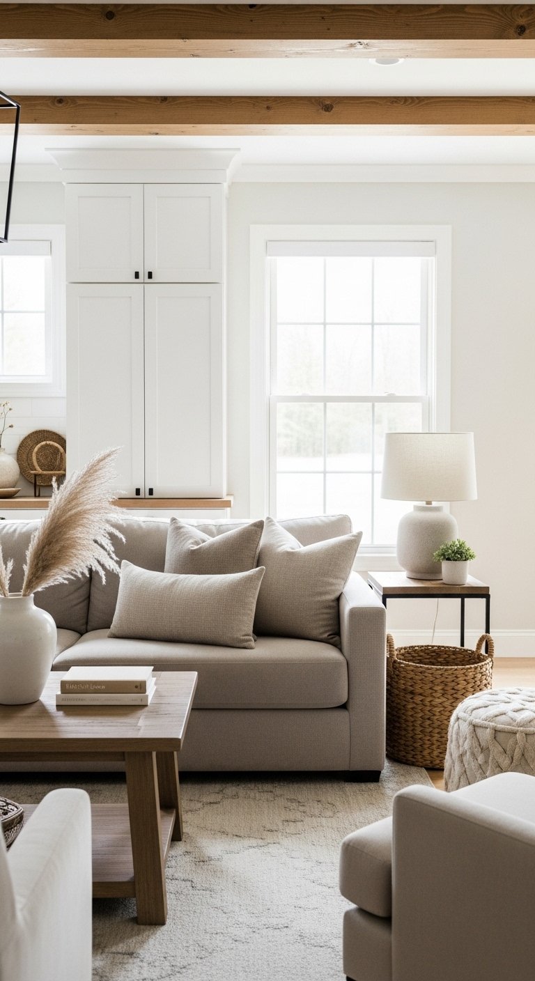 Mix two or three materials but stay within the same color family. Soft beige, taupe, cream, and muted gray work beautifully in a modern farmhouse living room. Texture adds interest while keeping the space peaceful. When pillows feel soft and inviting, people naturally want to sit down and relax. It’s a small update, but it makes a big difference in comfort and style.