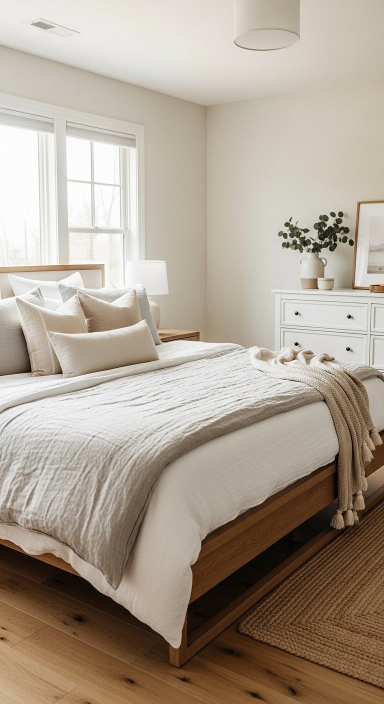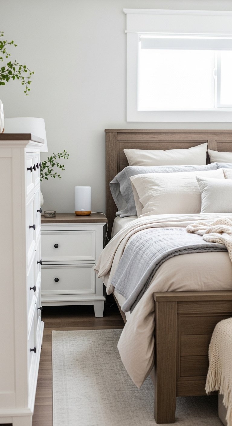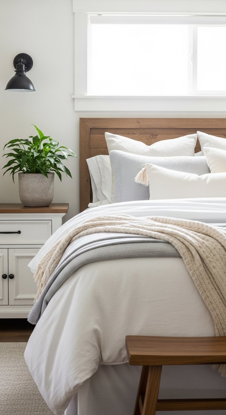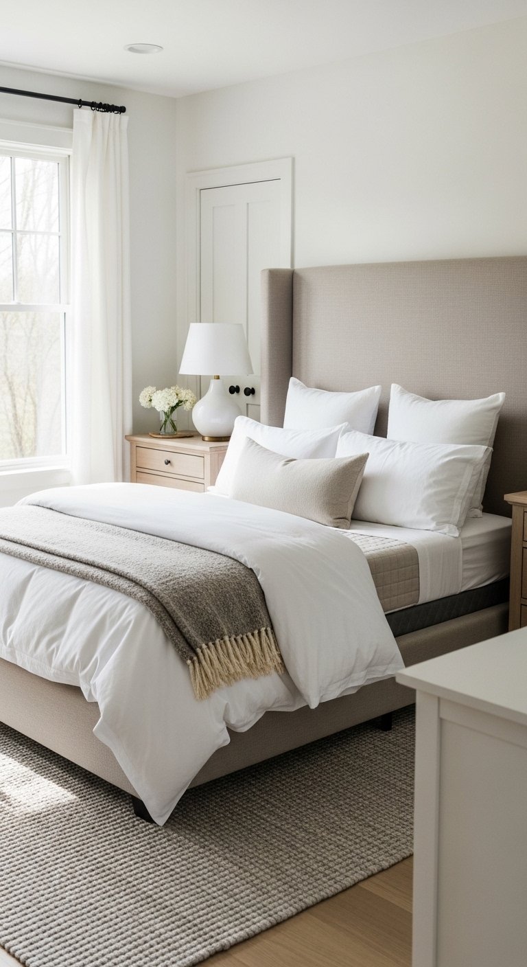 Stick to neutral shades that blend with your bedding. This keeps the space feeling calm and elegant.