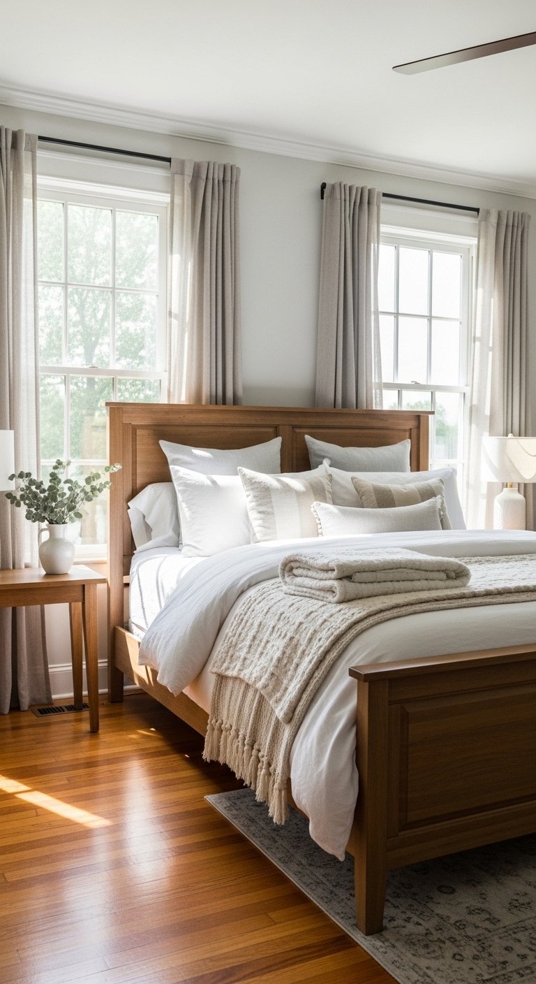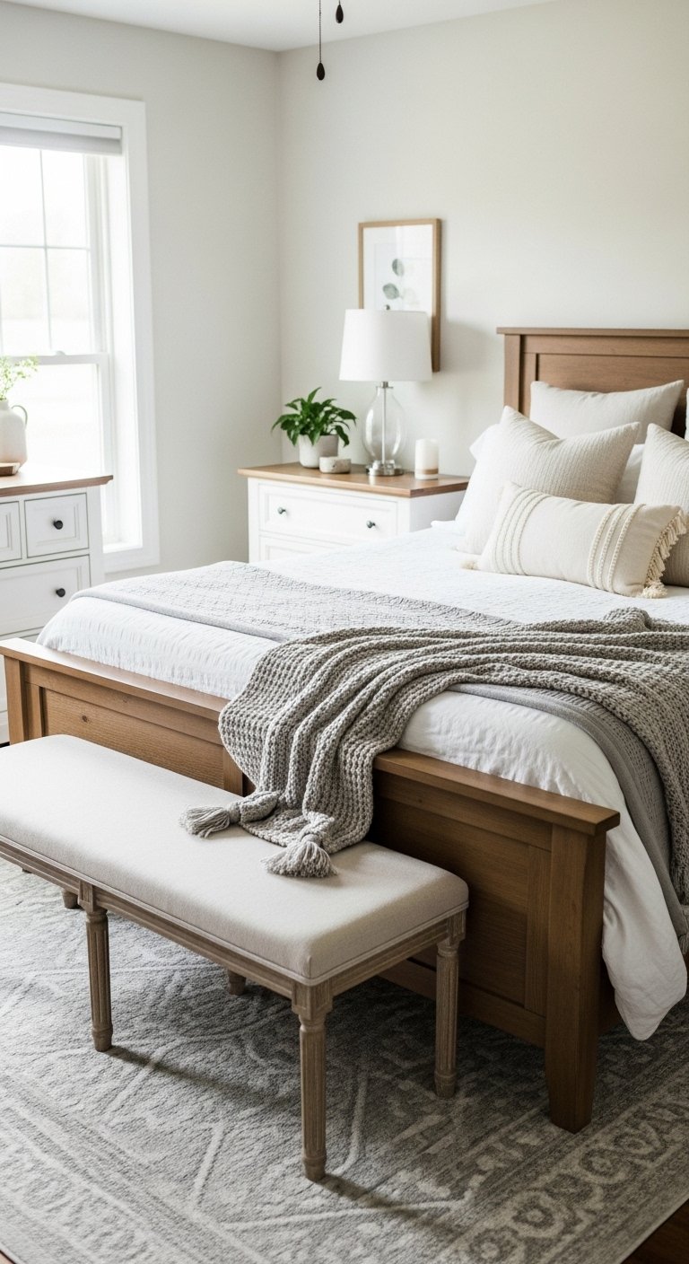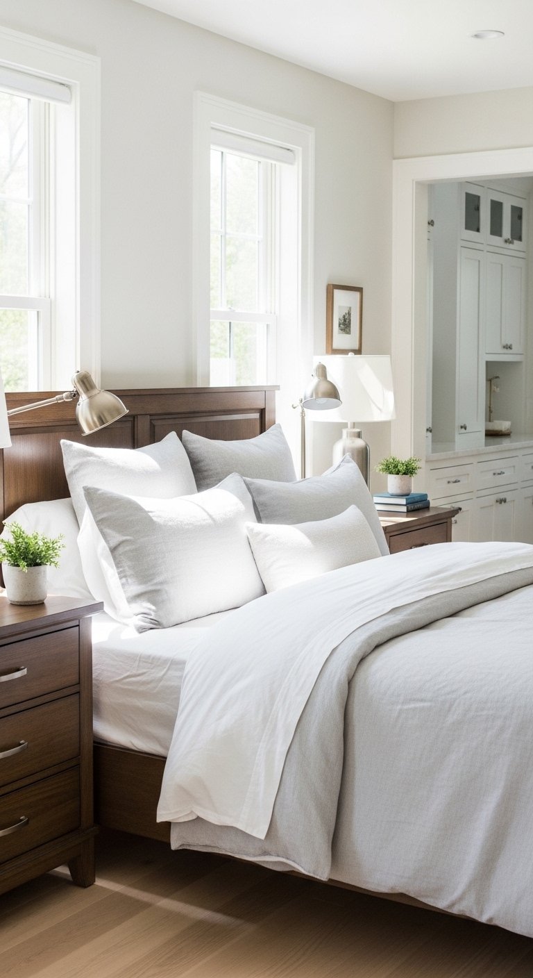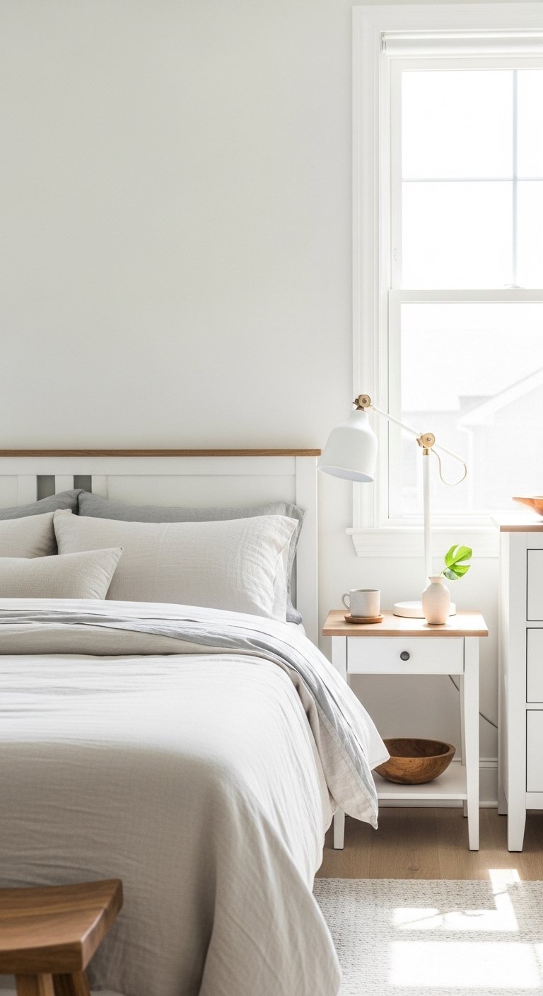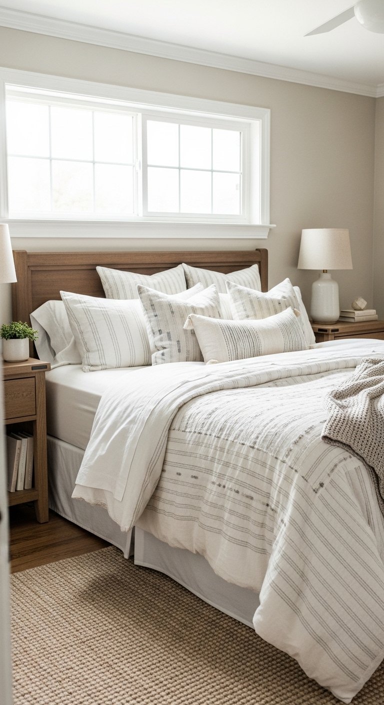 Stick to neutral shades that blend with your bedding. This keeps the space feeling calm and elegant.