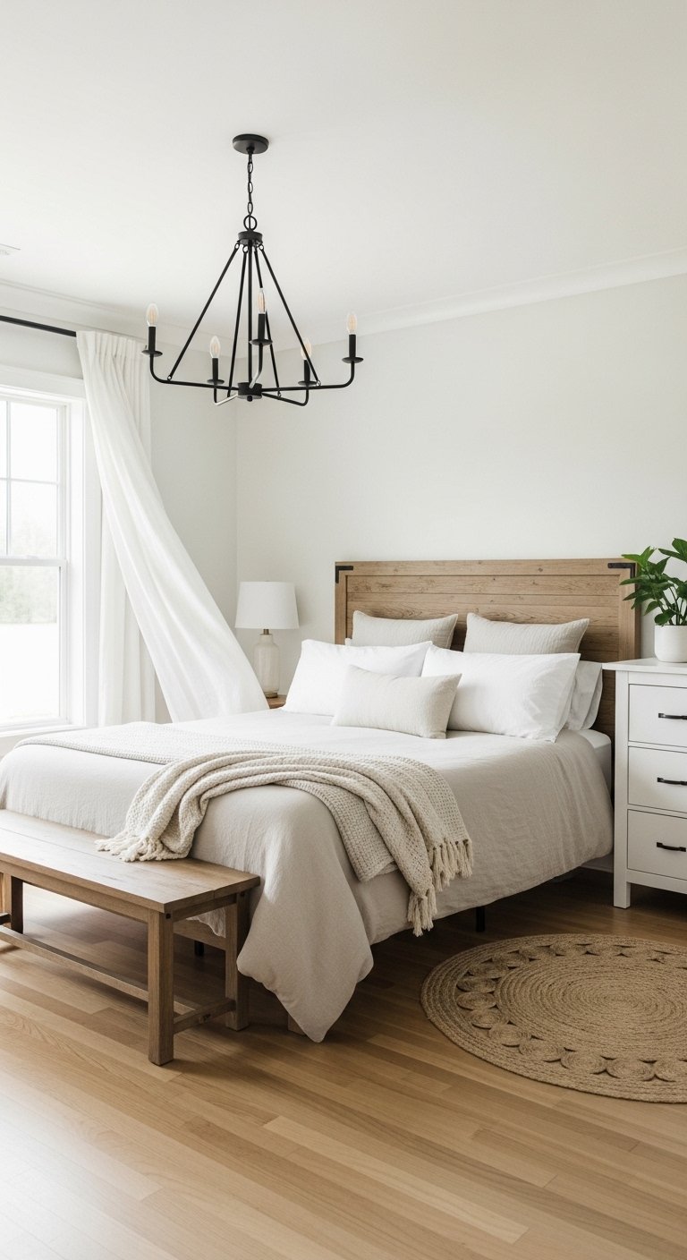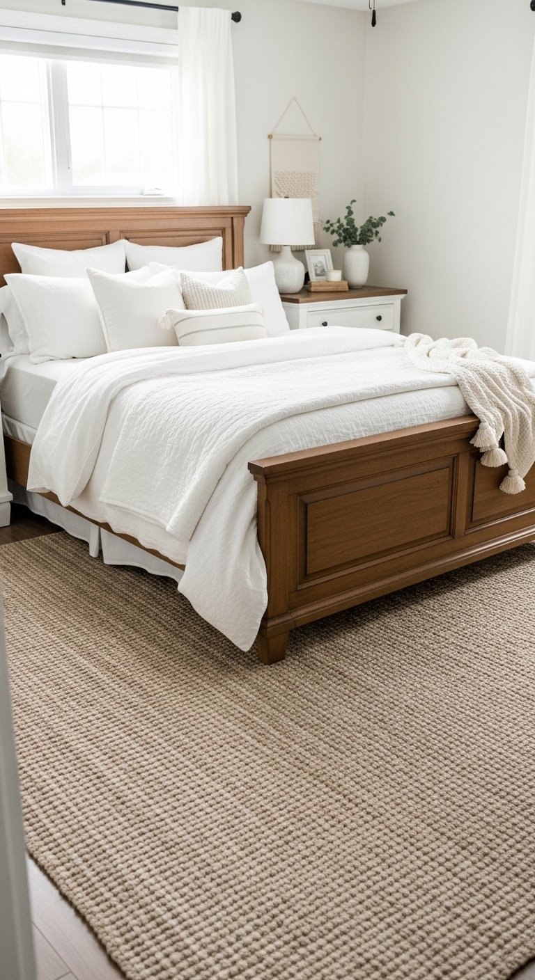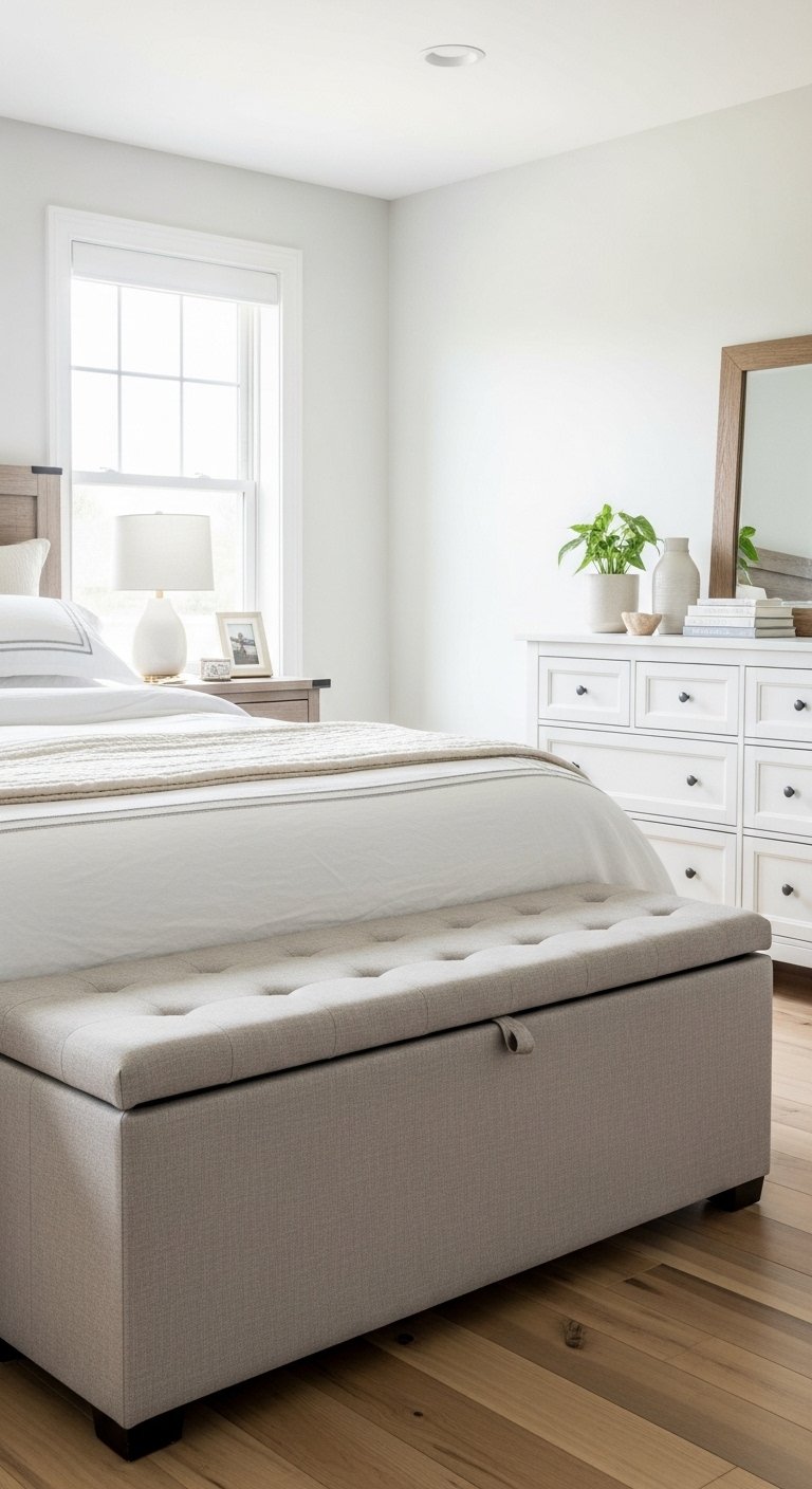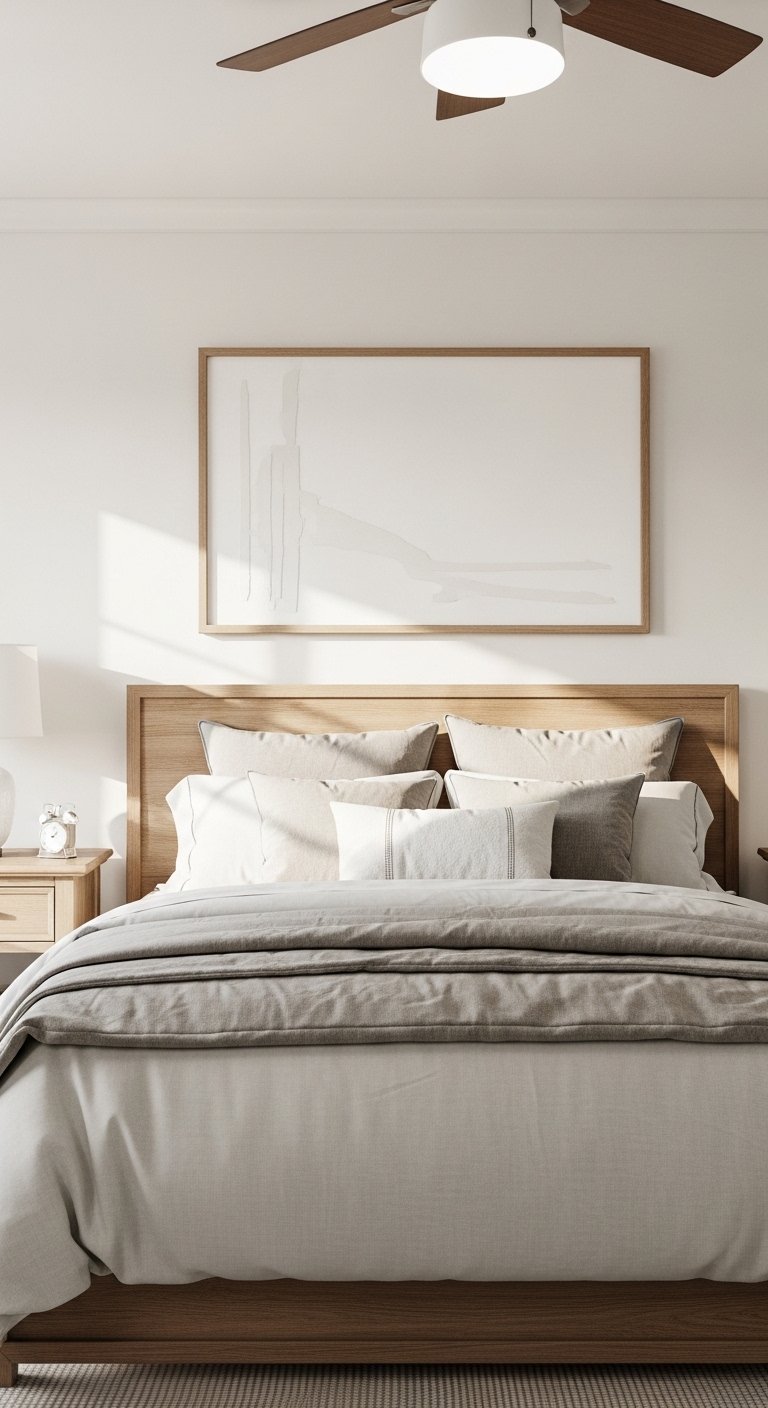 Stick to neutral shades that blend with your bedding. This keeps the space feeling calm and elegant.