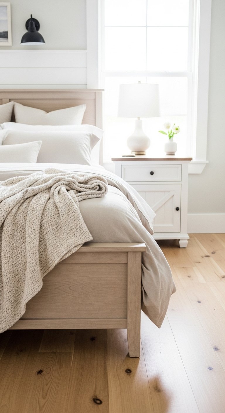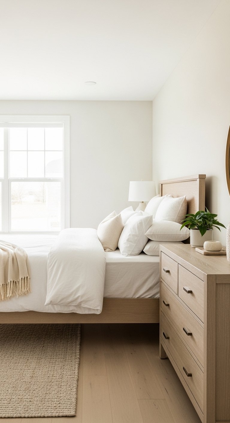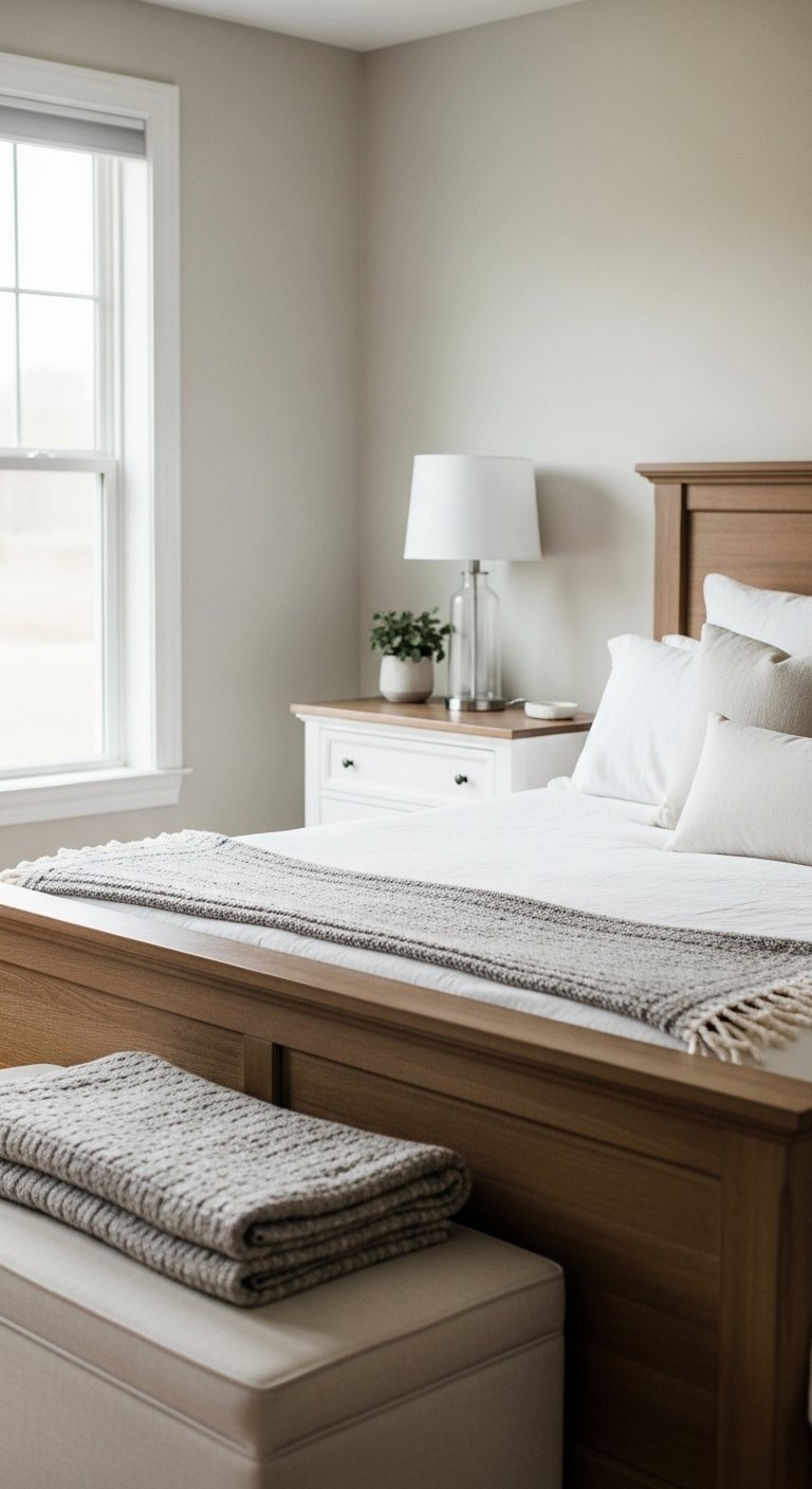 Light wood furniture adds warmth without making the space dark. A wood bed frame or dresser pairs well with neutral tones.