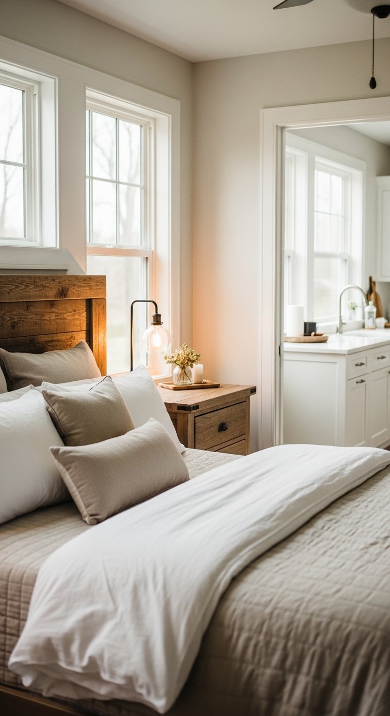 A taller headboard can also make your ceilings feel higher. This detail works especially well in a modern farmhouse master bedroom where texture and warmth matter.